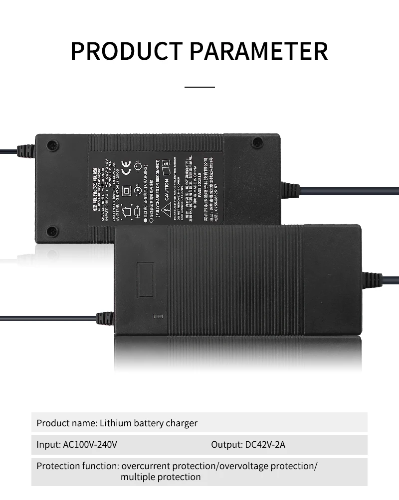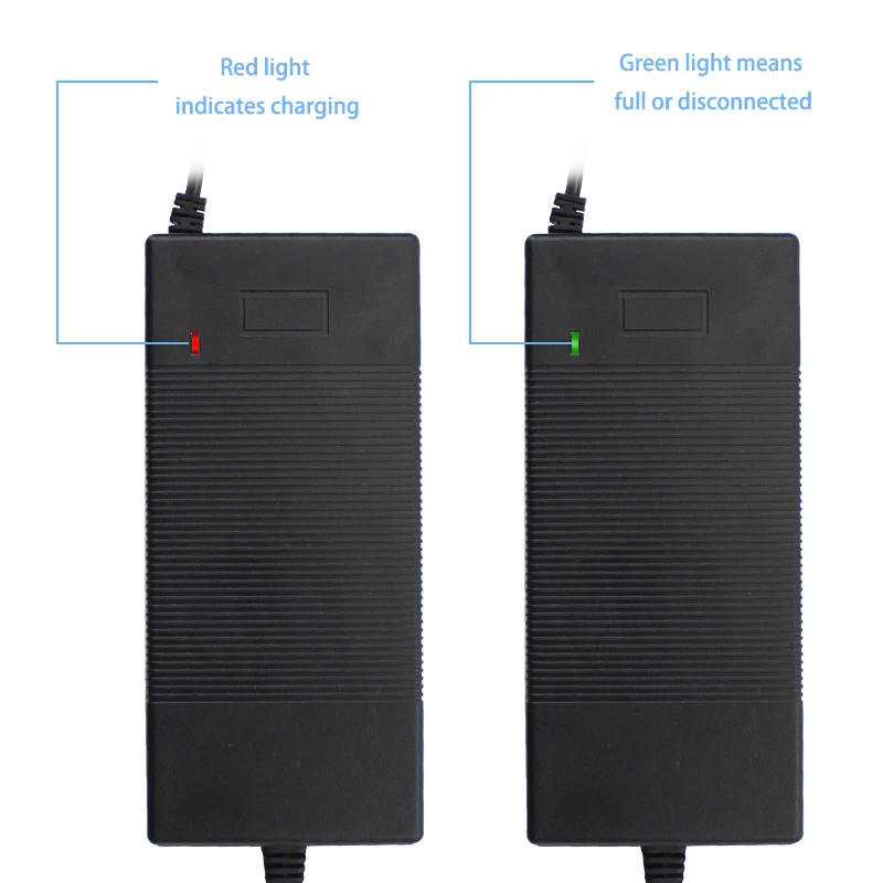 1.100% Brand New and high quality Super strong protection. 2.lnput : 100-240VAC,50/60Hz 3.Output : 42V 2A 4.Charge indicator:Charging the red light is full of green light 5.Security protection: OVP/OCP/ Overload protection/ Short-circuit protection 6.Color: Black 7.Power Max: 84W 8.Plug EU / US (Please choose the plug of your country, we will ship according to the plug of your choice, please leave a message to us if you don't know your country plug.) -Use and maintenance of the charger : 1. When charging, first connector to the battery, then connect to AC; after full, cut off AC, then pull the battery plug. If you pull the battery plug first while charging, especially when the charging current is large (red light), it is very easy to damage the charger. 2. When the LED light turns green, please continue charging for 2-3 hours. 3. Please do not run out of battery power, then charger. Otherwise the battery cannot be protected or even damaged. 4. long-term shallow discharge battery, about 3 months, for a deep discharge, is the so-called re-lighting, which is conducive to the activation of long-term immobile material in the deep part of the battery. Luminous means that riding the controller battery undervoltage protection action. 5.Please use the charger in a dry place in time. 6.When you do not use the charger, do not always connect the power supply. 7.Please confirm your battery, Because it is used to charge the lithium battery. Do not use the charger on the LiFepo4 battery, otherwise the charger will be got incredibly hot. -Package included: 1Pcs 42V 2A Charger