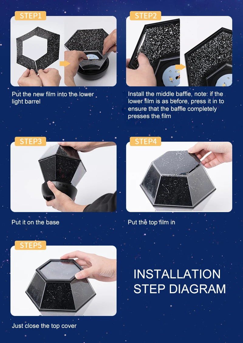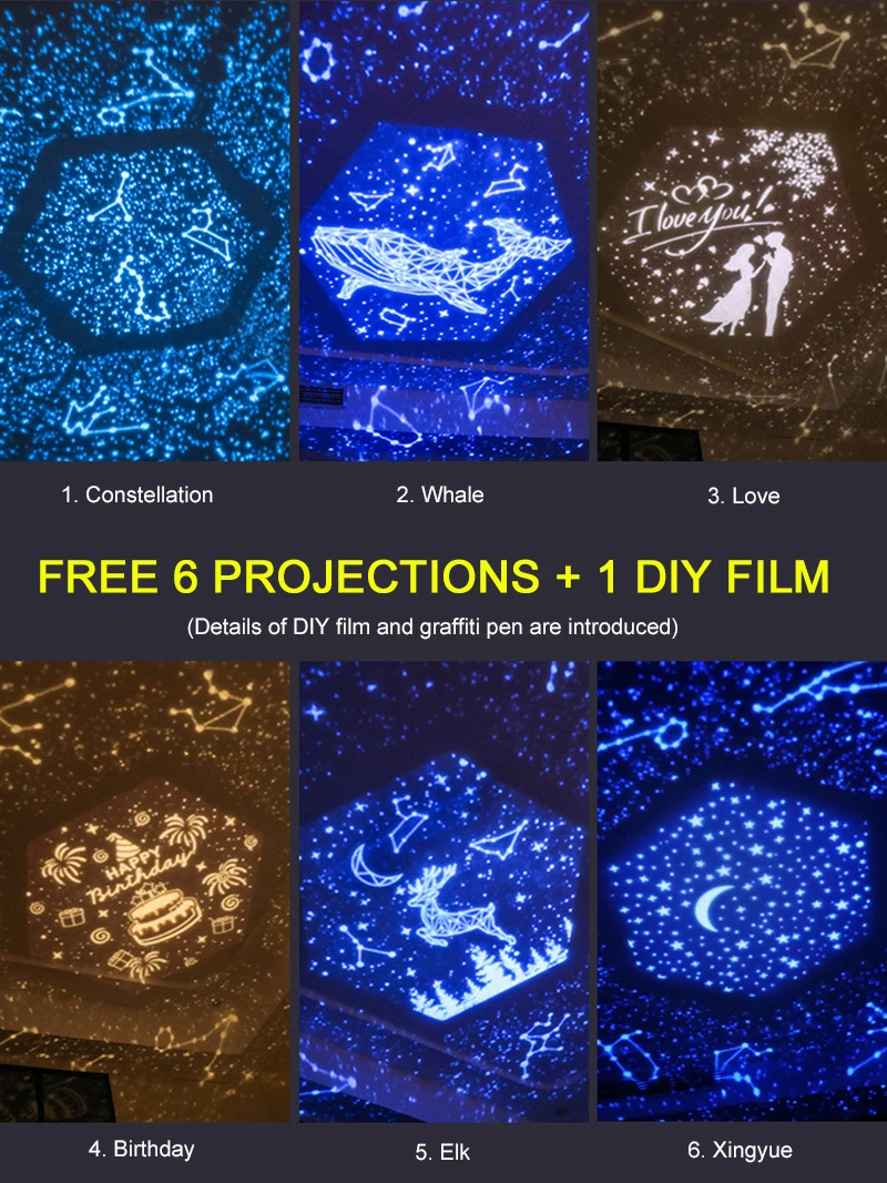 2. Шесть наборов пленки --- с волшебным созвездием, любовью, Китом, днем рождения, лося, звездной звездой. Таким образом, красивый светильник будет проектироваться на потолок или стену