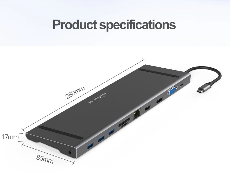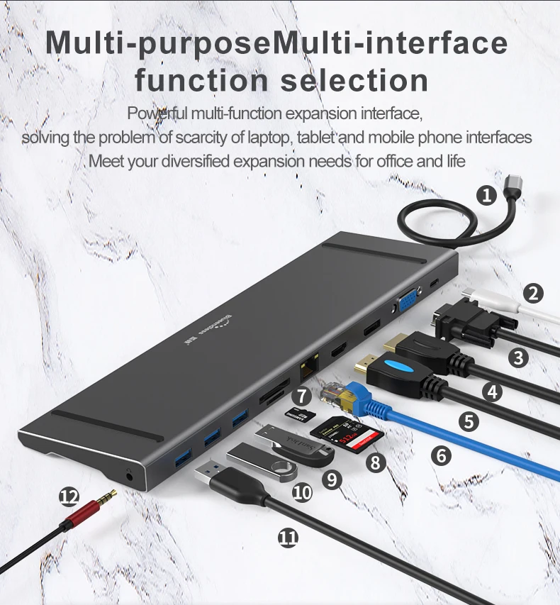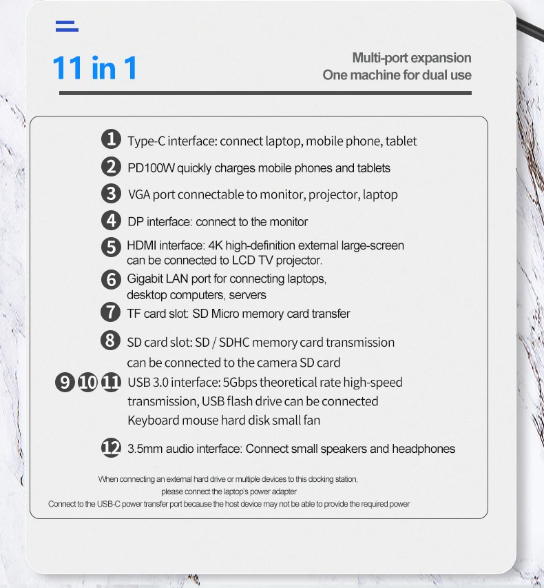 Пожалуйста, обратите внимание: Кабель HDMI, VGACable, RJ45Cable, SD/tf-карта и т. д., используются только в качестве полной функции продукта дисплея и не включены в посылка. Только usb-хаб в посылка Различные модели имеют различный интерфейс и внешний вид, пожалуйста, выберите подходящую модель перед покупкой: (1) HD1201 : 12-в-1: Поддержка МТС, Мульти-сенсорный экран расхождений в настройках экрана, только в том случае, Поддержка s систем windows. 2 * HDMI + VGA + RJ45 + SD/TF + 3 * USB3.0 + USC-C (Тип-C)+ 3,5 мм аудио + PD USB-C рот 。 Материал: Алюминий сплав + акриловым стеклом (2) HC1101 : 11-в-1: 2 * HDMI + VGA + RJ45 + SD/TF + 3 * USB3.0 + 3,5 мм аудио + PD USB-C рот (3) HC101C : 10-в-1: HDMI + VGA + RJ45 + SD/TF + 3 * USB3.0 + 3,5 мм аудио + PD USB-C рот (4) HC101A : 10-в-1: HDMI + VGA + RJ45 + SD/TF + 3 * USB3.0 + 3,5 мм аудио + PD USB-C рот (5) HC901: 9-в-1: HDMI + RJ45 + SD/TF + 3 * USB3.0 + 3,5 мм аудио + PD USB-C рот (6) HC901A: 9-в-1: HDMI + RJ45 + SD/TF + 3 * USB3.0 + 3,5 мм аудио + PD USB-C рот (7) HC701: 7-в-1: HDMI + SD/TF + 3 * USB3.0 + PD USB-C ртом (8) HV501: «5 в 1»: HDMI + USB3.0 + PD + VGA USB-C ртом (9) HUB050C: «5 в 1»: 3 * USB3.0 + SD/TF USB-C ртом HDMI поддерживает 4K 30HZ, VGA поддерживает 1080P,PD Зарядка: поддерживает максимум 60W. Важное замечание -При подключении к ноутбуку Не поддерживайте зарядку мобильного телефона через USB-A или USB-C женский порт из-за ограниченного тока. -Пожалуйста, предоставьте источник питания при подключении к энергоемким устройствам; Поддержка подключения только 1 HDD/SSD одновременно. -Чтобы предотвратить помехи Wi-Fi, вы можете обернуть корпус линии рядом с портом type-c фольгой или с помощью маршрутизатора частоты 5 ГГц. Кроме того, При неиспользовании отключите ethernet-кабель и PD зарядный кабель от адаптера. -Для Samsung Galaxy S10/S9/S8/Note9/8, он совместим с режимом Dex через концентратор, версия телефонной системы требует Android 9,0 или выше. -Для ноутбуков Xiaomi мы предлагаем подключение к неоригинальному адаптеру питания PD, например, к адаптеру питания Apple, Dell для обеспечения нормального использования.