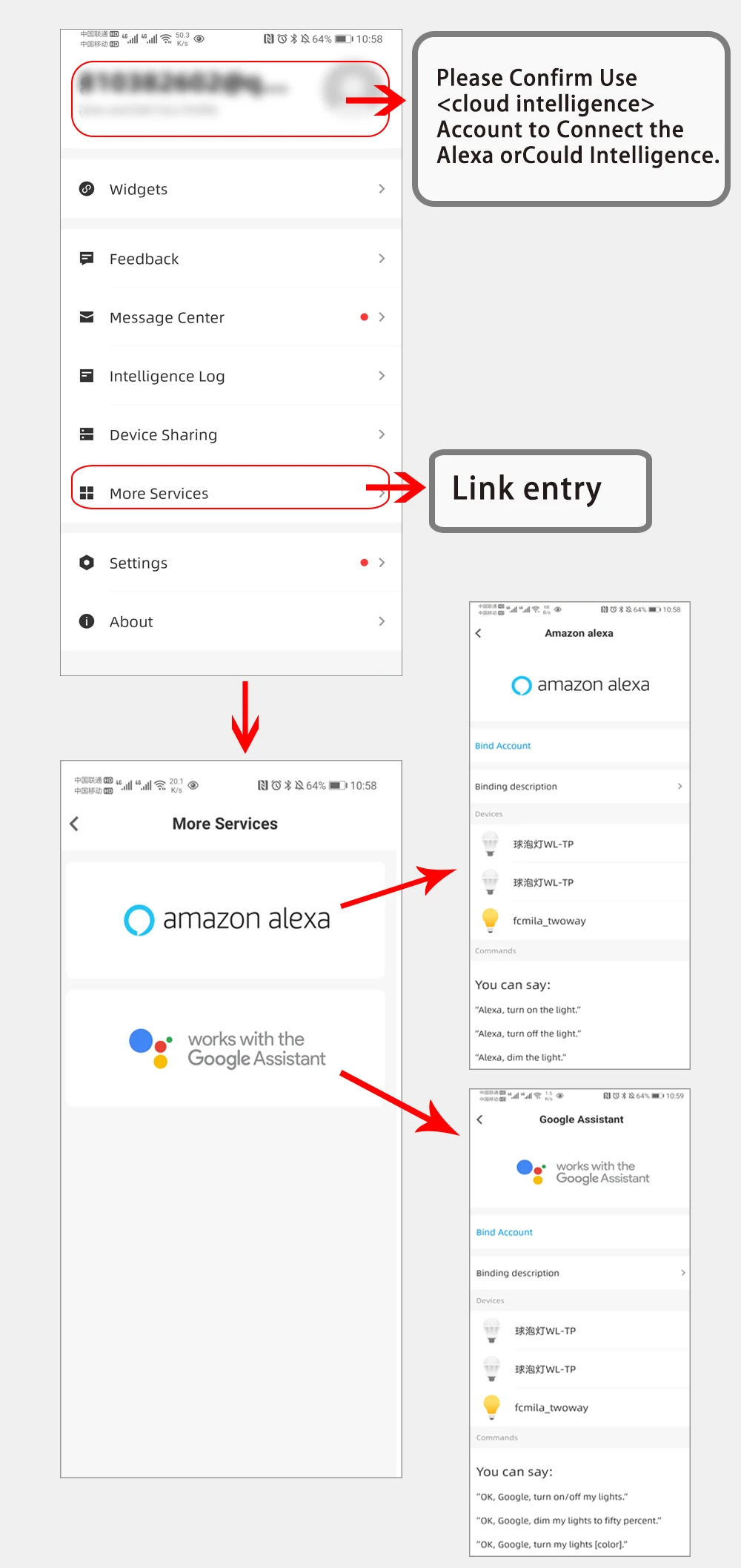 Примечание: Используйте учетную запись приложения <Cloud intelligence> для подключения Alexa или Google assistant.