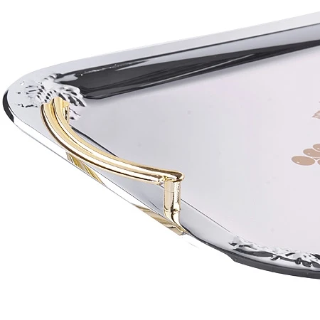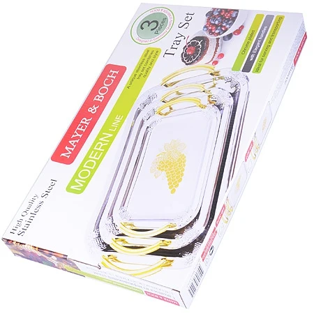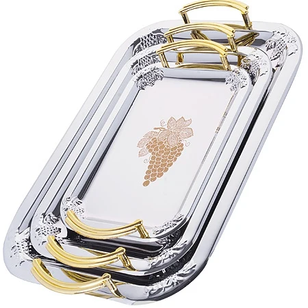 Набор из трех сервировочных подносов разного размера, изготовленных из нержавеющей стали с зеркальной полировкой, станет незаменимым предметом для сервировки стола. Они имеют прямоугольную форму и оформлены декоративными элементами и ручками золотистого цвета.Подносы отлично подойдут для подачи рыбных блюд, а традиционные блюда будут выглядеть на них более аппетитно. Благодаря оригинальному дизайну сервировочные подносы придадут элегантный вид любому обеденному столу.Современный стильный дизайн и функциональность позволят подносам занять достойное место на Вашей кухне.