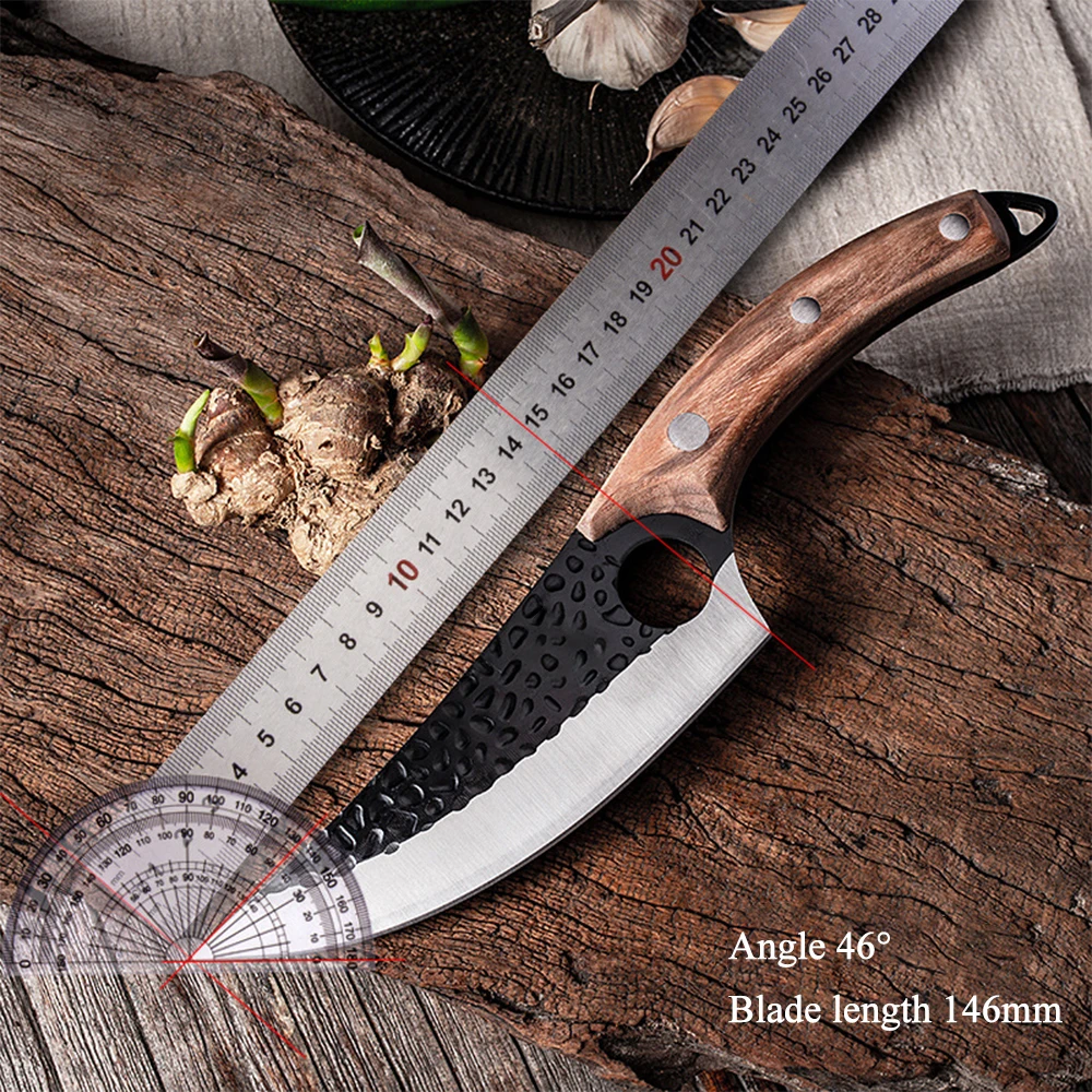 Характеристика 1. Это будет идеальным выбором для использования на кухне, в кемпинге, барбекю или на охоте. Нож не только хорошо снимает мясо с костей, но и ловко режет, нарезает, и кости с мясом и овощами. 2. Специальная форма кривой и кованый дизайн следа не только выглядит круто также имеет отличный баланс. Он был немного тяжелее обычного кухонного ножа, но не нужно беспокоиться о весе, превосходно сбалансированный и дополнительный вес просто делает резку и нарезание более приятными, так как вес помогает в нарезке через вещи. 3. Лезвия изготовлены из высококачественной углеродистой нержавеющей стали. После ковки и закалки молекулярное расположение в стали становится ближе, что придает лезвию отличную твердость и удержание края. Полная конструкция tang, которая отличается от общей сварочной рукоятки для ножей шеф-повара, не сломается после длительного использования. 4. Подвесное отверстие ручки позволяет повесить, легко хранить. 5. Мы оснащены коровьи ножи для кожи оболочки для вас, если вы хотите дать его своей семье в качестве подарка или взять его в лагерь, барбекю, это будет идеальным выбором. Мы уверены, что вам понравится универсальный нож для скрепления костей! Спецификация Материал: нержавеющая сталь Длина: 273 мм Длина лезвия: 146 мм Ширина лезвия: 50 мм Толщина: 4 мм Примечание 1. Весь процесс производства этого ножа полностью ручной. 2. Поверхность кованого ножа не такая гладкая, как нож, изготовленный машинами, но она показывает характеристики кованого ножа. 3. Возможны незначительные отклонения в измерениях из-за ручного измерения. Посылка включает в себя 1 х нож для скрепления 1 чехол для ножей из искусственной кожи