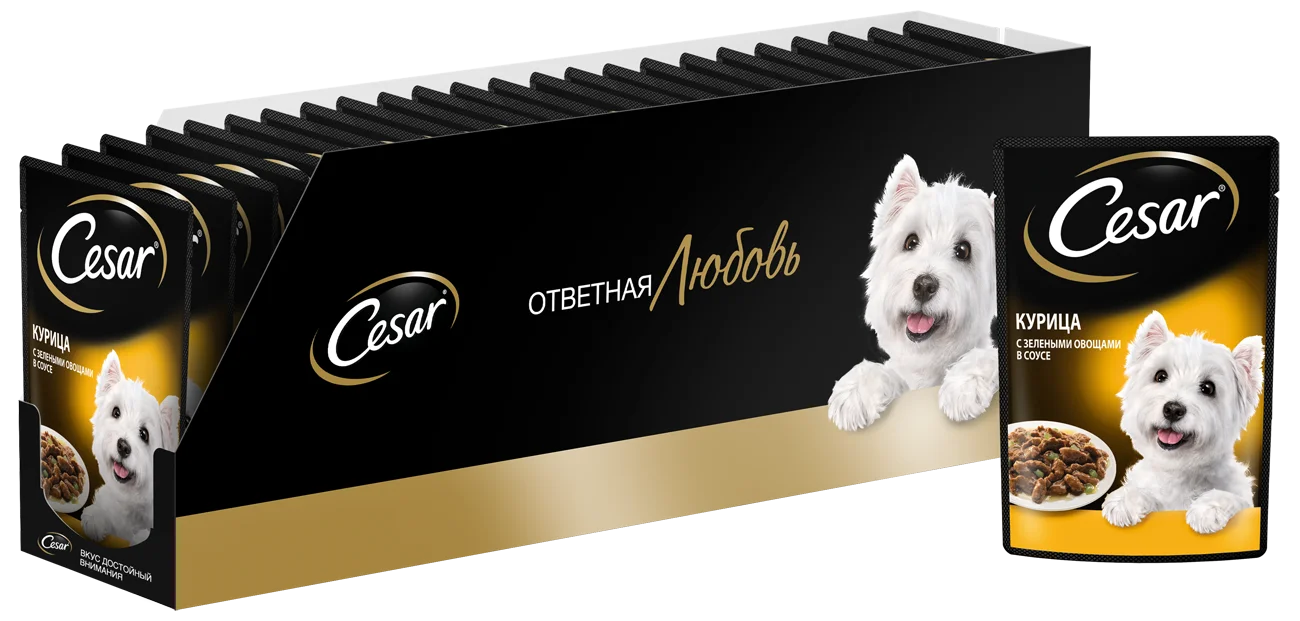 Это аппетитные кусочки из курицы с отборными овощами в густом ароматном соусе. Аппетитные блюда CESAR® – это вкусные, сбалансированные рационы для собак, которые помогут окружить вашего любимца заботой и вниманием. Рационы готовятся по уникальной рецептуре, в состав входят натуральные ингредиенты: они не содержат искусственных красителей, усилителей вкуса и консервантов. Блюда CESAR® обязательно придутся по вкусу вашему любимцу. Рекомендуемое количество корма CESAR® (вес животного, кг – упаковок корма в сутки, шт): 3 кг – 3-4; 4 кг – 4-5; 6 кг – 6-7. Вашего питомца следует кормить кормом комнатной температуры. Состав: мясо и субпродукты (в том числе курица), продукты переработки злаков, плазма крови, овощи, минеральные вещества, витамины, свекловичный жом, загустители, метионин*. Содержание питательных веществ (100 г): белок – 8,0 г; жир – 3,5 г; зола – 1,5 г; клетчатка – 0,3 г; влага – 85 г; витамин А – не менее 150 МЕ; витамин Е – не менее 1,2 мг. Энергетическая ценность (100 г): 68 ккал. Хранить при температуре от + 4*С до + 35*С и относительной влажности воздуха не более 75%