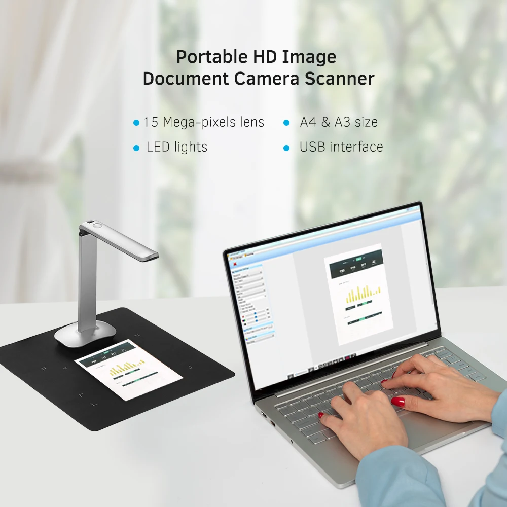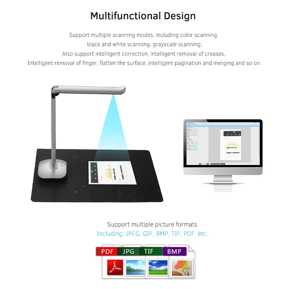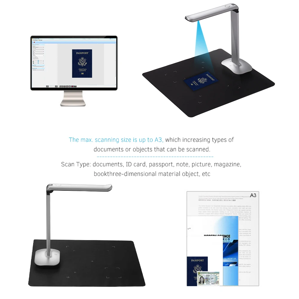 Портативный сканер документов Aibecy специально разработан для использования в офисе, классе, библиотеки, банке, больницах и т. д. С датчиком изображения super HD (15 мегапикселей), он может достичь высокой скорости (около 1 секунды) сканирования в реальном времени. С верхней конструкцией CMOS датчика, регулируемая высота и Макс. Размер сканирования до A3, который увеличивает типы документов или объектов, которые могут быть отсканированы, такие как документы, которые имеют различные размеры и формы или в папках, и предметы, такие как книги, журналы, удостоверение личности, паспорт, И т. Д. Он также поддерживает фотосъемку, Создание PDF и другие функции. Светодиодный светильник с регулируемой яркостью делает сканирование более точным и четким. Складная конструкция размера, удобная для движения и переноски на открытом воздухе. Благодаря этому ваша работа станет более удобной, более эффективной и экологически приятной.