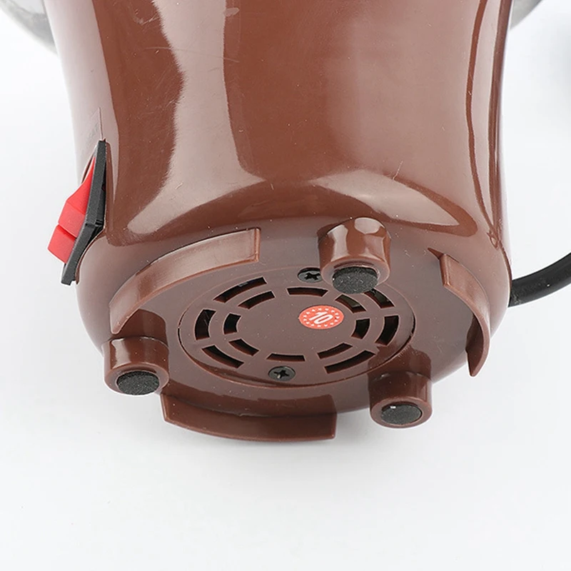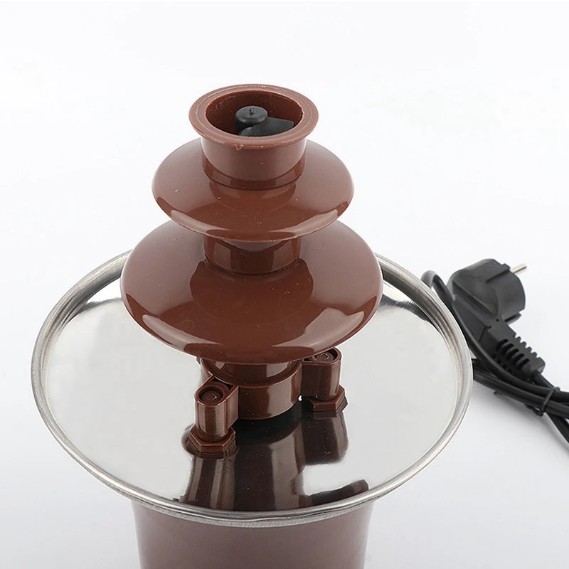 После установки и выравнивания фонтана, Пожалуйста, подключите питание, сначала нажмите кнопку тепла слева, предварительно нагрейте в течение двух минут, затем залейте 2-4 фунта растопленного шоколада в миску из нержавеющей стали. Нажмите кнопку fountian справа. Винт поворачивается И шоколад подведен к верхней части башни и медленно скользит вниз по верхней части башни, образуя шоколадный водопад, и шоколадный аромат также излучается. Пользователь может использовать вилку для вилки различных Продукты питания