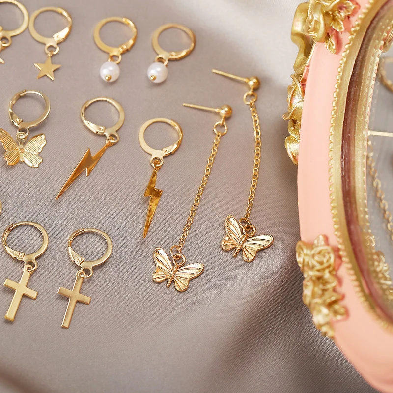 7 пар, милые серьги-подвески с кристаллами, бабочками, крестиками и звездами для женщин и девочек, золотой цвет, комплект серег-колец, смешанный стиль, ювелирное изделие