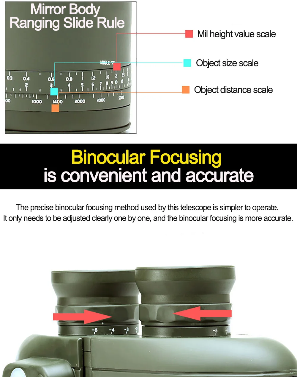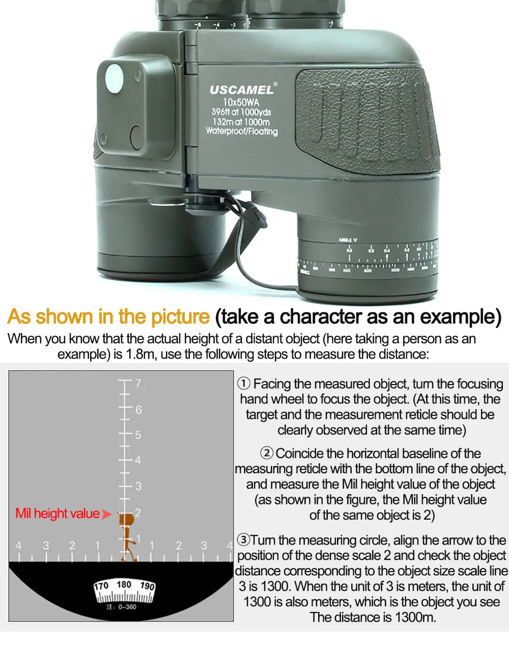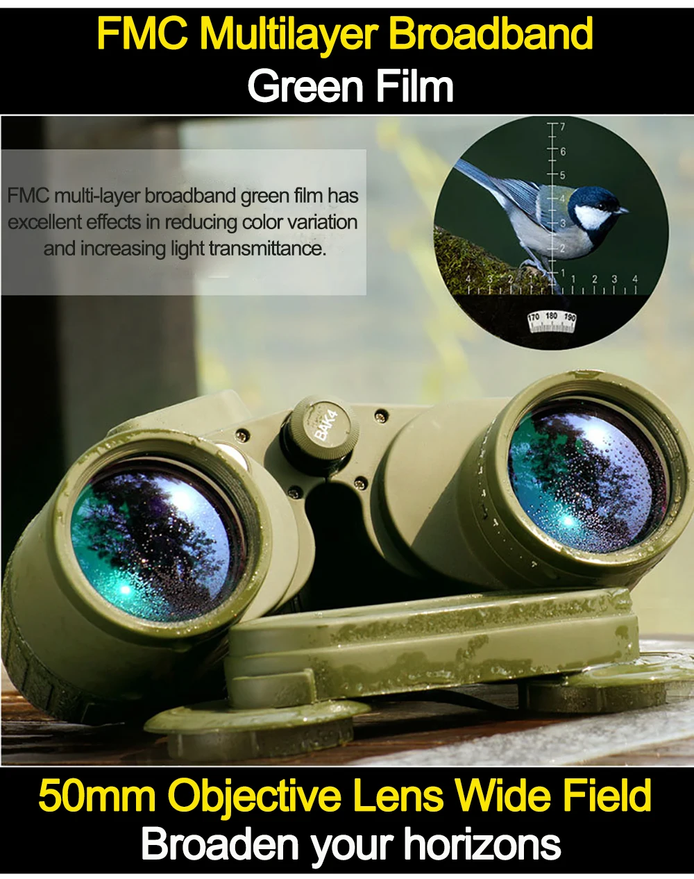 · Бинокль имеет большой 50 мм объектив, даже в условиях низкой светильник условия, такие, как в сумерках и рассвет, также могут обеспечить максимальную яркость изображения