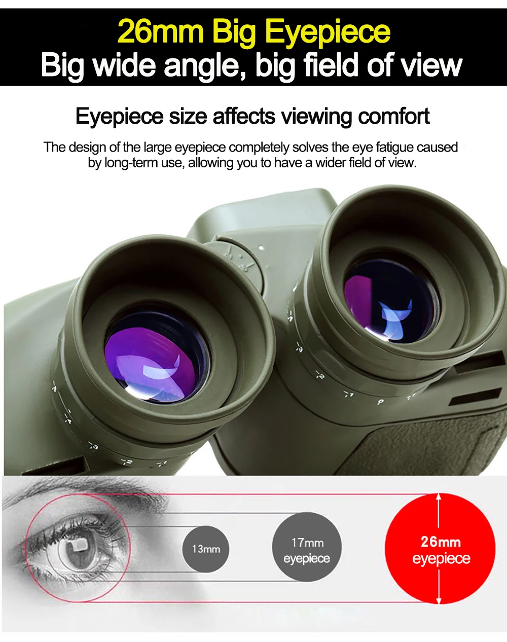 · Дизайн больших линз, объектив 26 мм более удобен для просмотра объектов без усталости глаз, головокружения, с сочетанием зрения с широким углом обзора и HD
