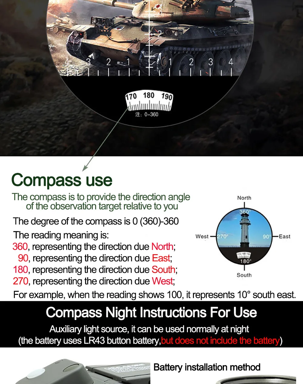 · Внутренняя шкала дальномера и направленный компас с переключателем освещения указывают расстояние или размер объекта, который просматривается и его ориентация