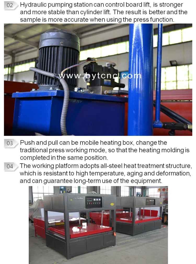 Сфера применения и материал: 1) изготовление пластмассовых форм и масок 2) Изготовление рекламных вывесок 3) учебные эксперименты в университетах или научно-исследовательских учреждениях 4) изготовление шоколада и коробка для упаковки тортов 5) Промышленное и автомобильное украшение 6) другие промышленные термопластичные материалы 7) Материал применения: PMMA (акрил), ПВХ, АБС, ПЭ, ПЭТ, полистирол, полипропилен и т. Д. Особенность: 1. Эта машина имеет функцию поглощения, нажатия и обдува, и каждая функция может управляться независимо. 2. Гидравлическая насосная станция может управлять подъемом платы, прочнее и стабильнее, чем подъем цилиндра. Результат лучше, и образец более точный при использовании функции пресса. 3. Нажимать и тянуть можно с помощью мобильного нагревательного ящика, изменить традиционный режим работы нажатием, чтобы нагревательное формование было выполнено в том же положении. 4. Рабочая платформа имеет цельностальную термообработку, которая устойчива к высоким температурам, старению и деформации и может гарантировать длительное использование оборудования. 5. Движущаяся пластина с помощью стойки и шестерни делает движущуюся пластину более стабильной. 6. Интеллектуальный контроль температуры, нагревательный блок использует форму отражателя и утолщенный изоляционный слой, быстрый нагрев и хорошие изоляционные и безопасные характеристики. 7. Нагреватели по индивидуальному заказу с завода, которые могут работать 24 часа непрерывно, срок службы до 8000-10000 часов, разница рабочих температур составляет ± 5 градусов, что может обеспечить равномерное смягчение пластины.