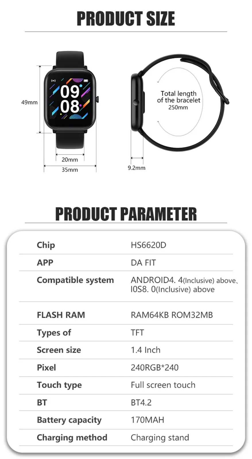 Размер браслета (мм) L * W * H = 36,3*43*10,4 Вес: 40 г Цвет: противотуманный серый, Ледниковый синий, Эрл черный, розовый Основная функция записи упражнений (подсчет шагов, расстояние, расчет калорий), Режим упражнений, толчок сообщений, хранение информации, Измерение частоты сердечных сокращений, Мониторинг сна, секундомер, управление камерой, управление музыкой, полный шрифт Язык, 1,4-дюймовый цветной экран touc-дисплей Чип Производитель: huntersun Чип: HS6620D Приложение: Да Подходит для Совместимая система: Android4.4 (содержит), IOS8.0 (содержит) выше Флэш-память Память: RAM128KB ROM32Mb Тип: на тонкопленочных транзисторах на тонкоплёночных транзисторах Сенсорный экран Размер: 1,4 дюйм (ов) Пиксели: 240RGB * 240 Тип сенсорного экрана: сенсорный экран BT:BT4.2 G-сенсор: Silan SC7A20 Гироскоп: нет В форме сердца Скорость: Tianyi Hexin HRS3300 GPS "нет Тип батареи: литий-полимерный Емкость: 170 мА-ч Режим зарядки: Подставка для зарядки Da Fit Приложение Функция:Посылка список: