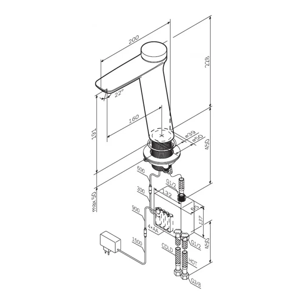 Состав поставки: смеситель, комплект креплений, комплект подводки, блок питания, комплект батарей питания 4хАА, инструкция