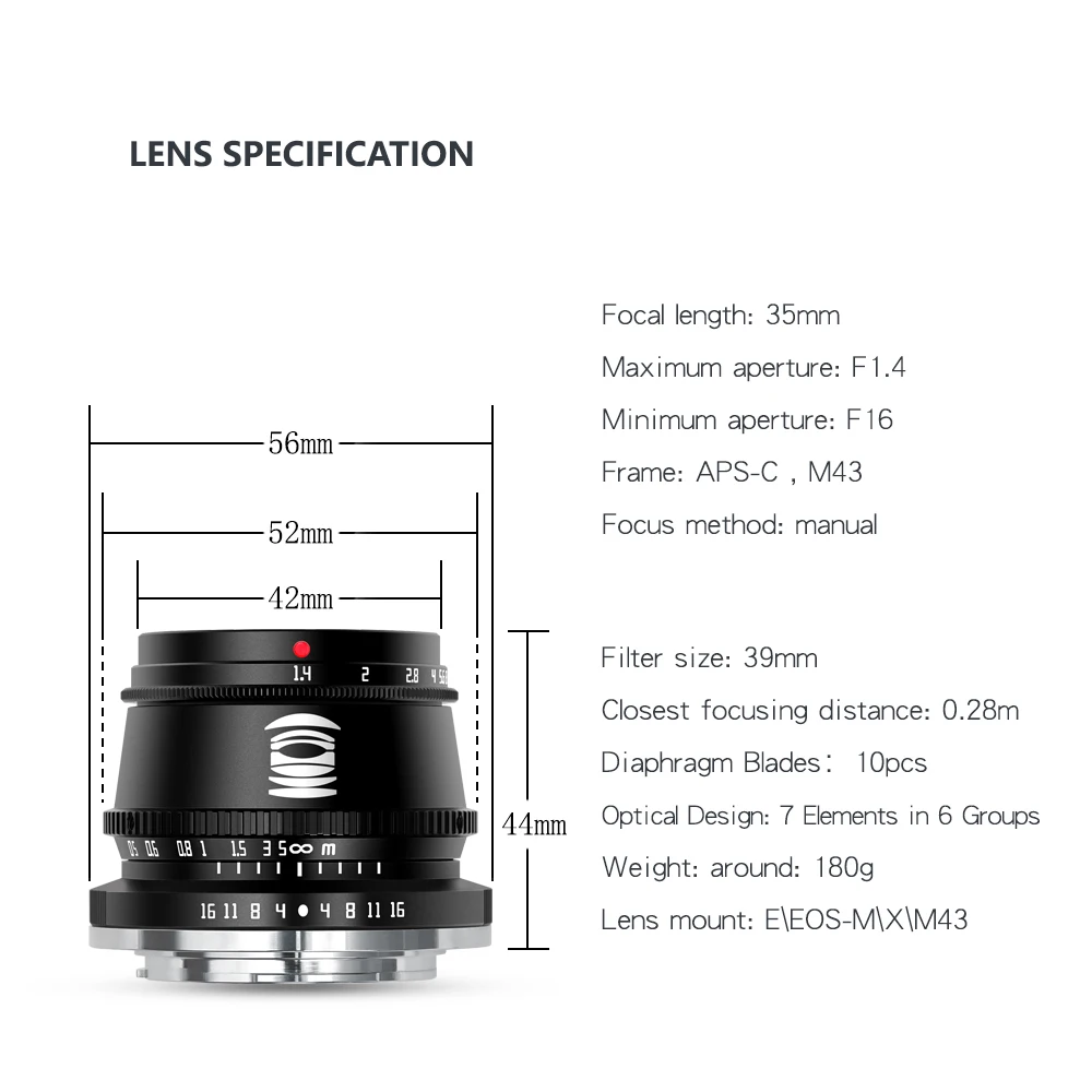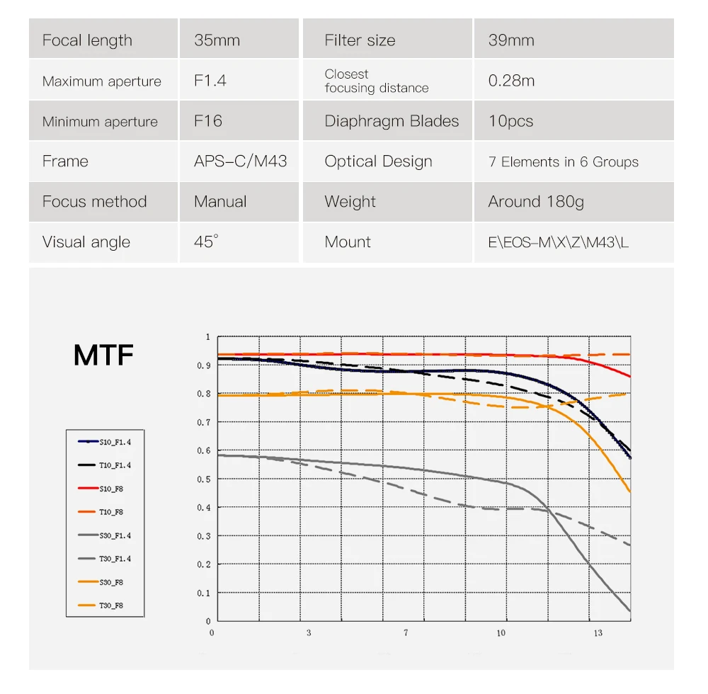 Фокусное расстояние: 35 мм максимальная диафрагма: F1.4 Минимальная диафрагма: F16 Тип оправы: aps-c номера лезвий: 10 шт. конструкция линз: 6 групп, 7 элементов метод фокусировки: ручная фокусировка объектива Анти-тряска: без анти-тряски ближайший фокус: 0,28 м Материал линз: металл Вес: 180 г Размер фильтра: 39 мм