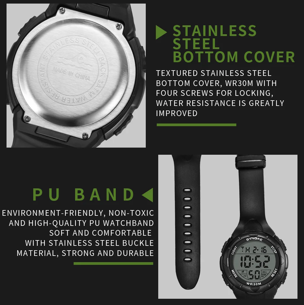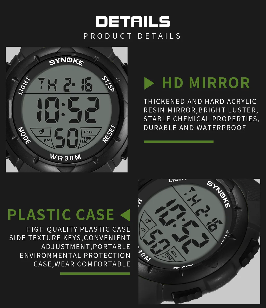 Функция: светящийся, будильник, WR30M водонепроницаемый, ежечасный, часовой обратный отсчет, отображение дня недели, 12/24 часовая система.