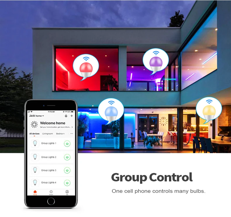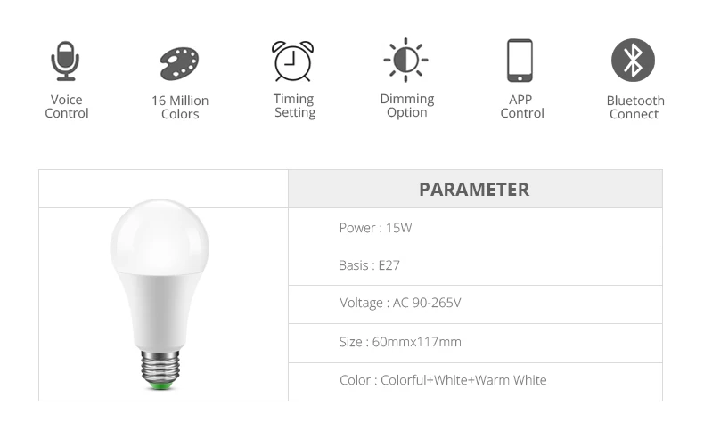 Тип: умный светодиодный светильник Bluetooth или WIFI Тип цоколя: E27 Мощность: 15 Вт Материал: алюминий + АБС-пластик Напряжение: 85- 265 В переменного тока Цвет излучения: RGBCW = полные цвета (16 миллионов цветов); RGBCW WW = полные цвета (16 миллионов цветов) + теплый белый;