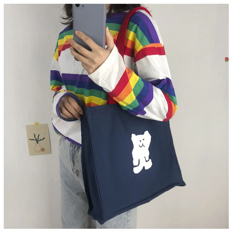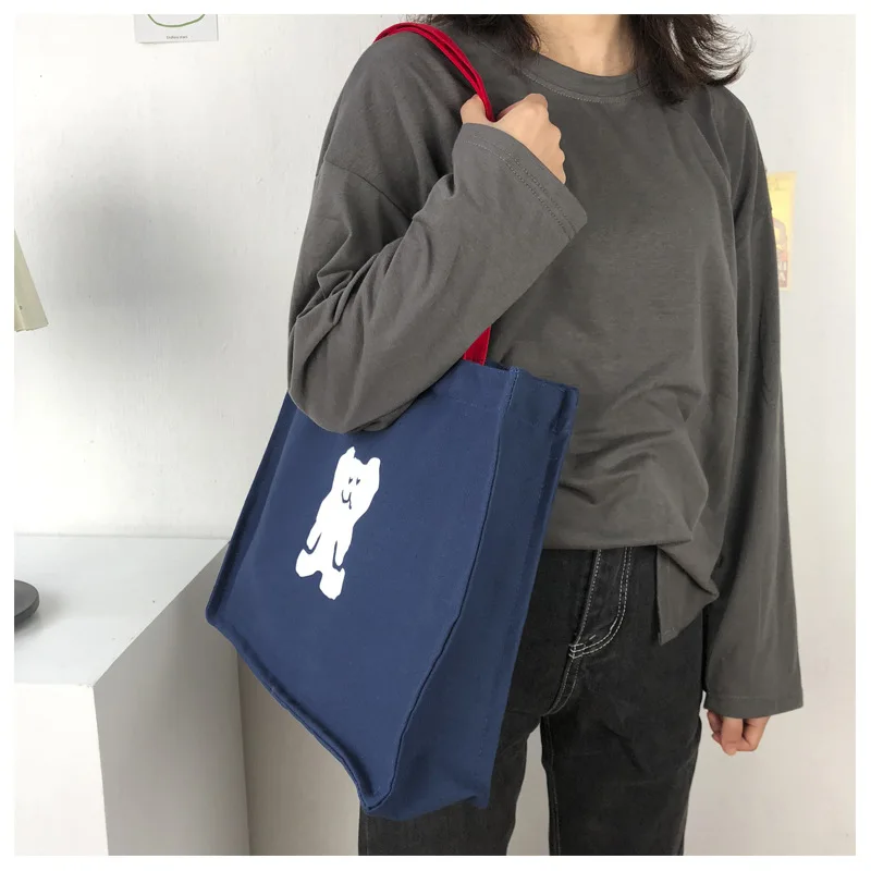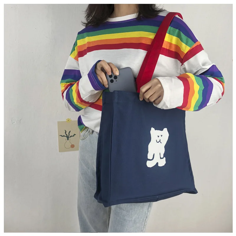 Сумка через плечо в Корейском стиле с мультипликационными изображениями медведя, Холщовая Сумка с цветочным принтом, школьная сумка с ремешком через плечо, Экологичная сумка для шоппинга