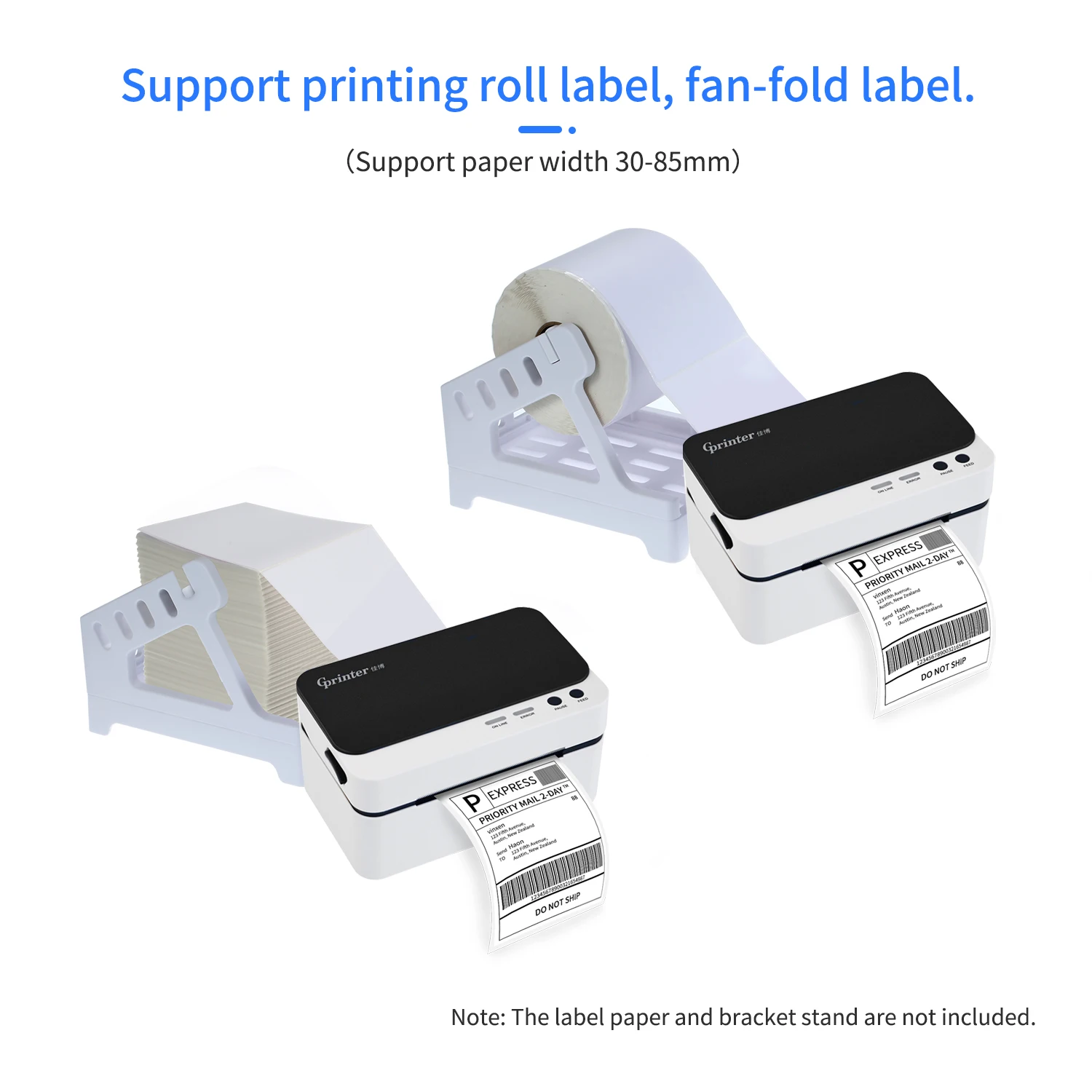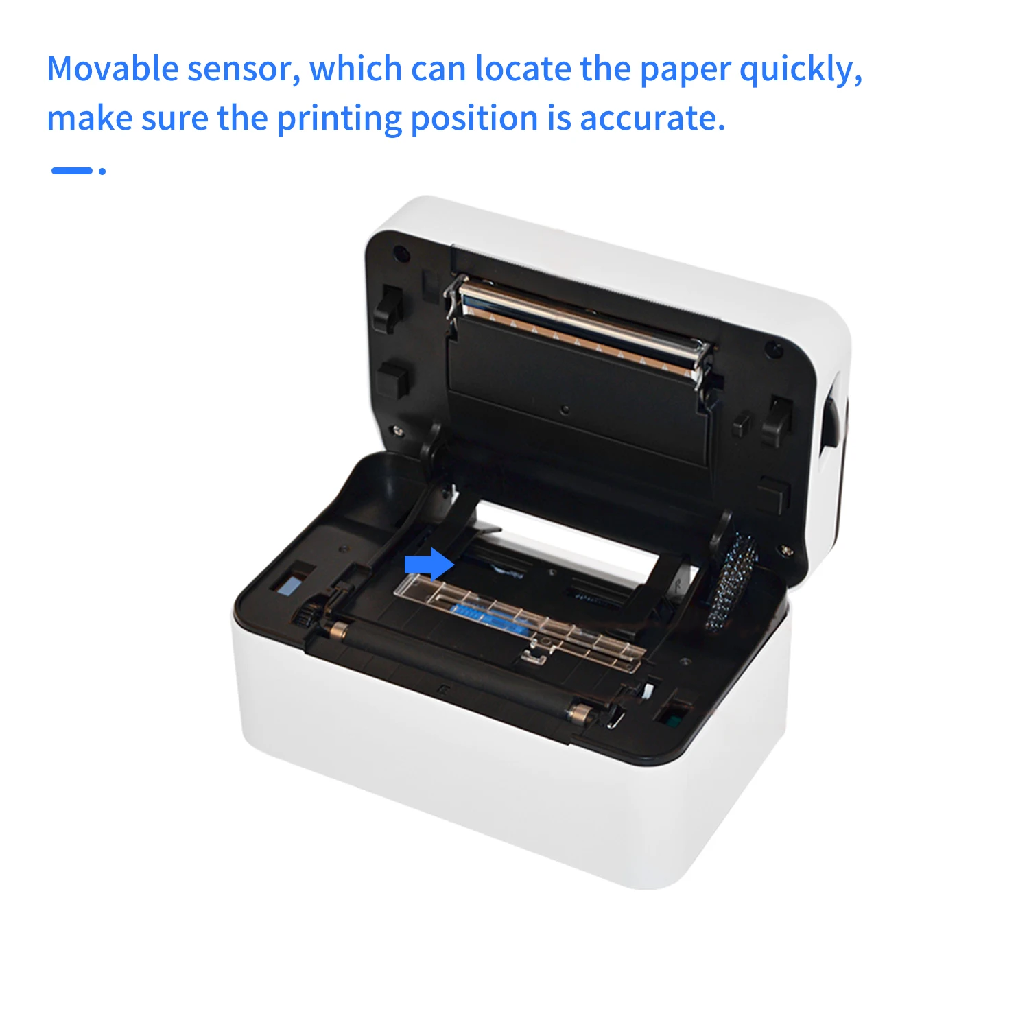 Поддержка печати рулонной этикетки, fan-fold этикетки. Принтер может напечатать бумагу шириной 30-85 мм. Подвижный датчик, который может быстро найти бумагу, убедитесь, что положение печати является точным.