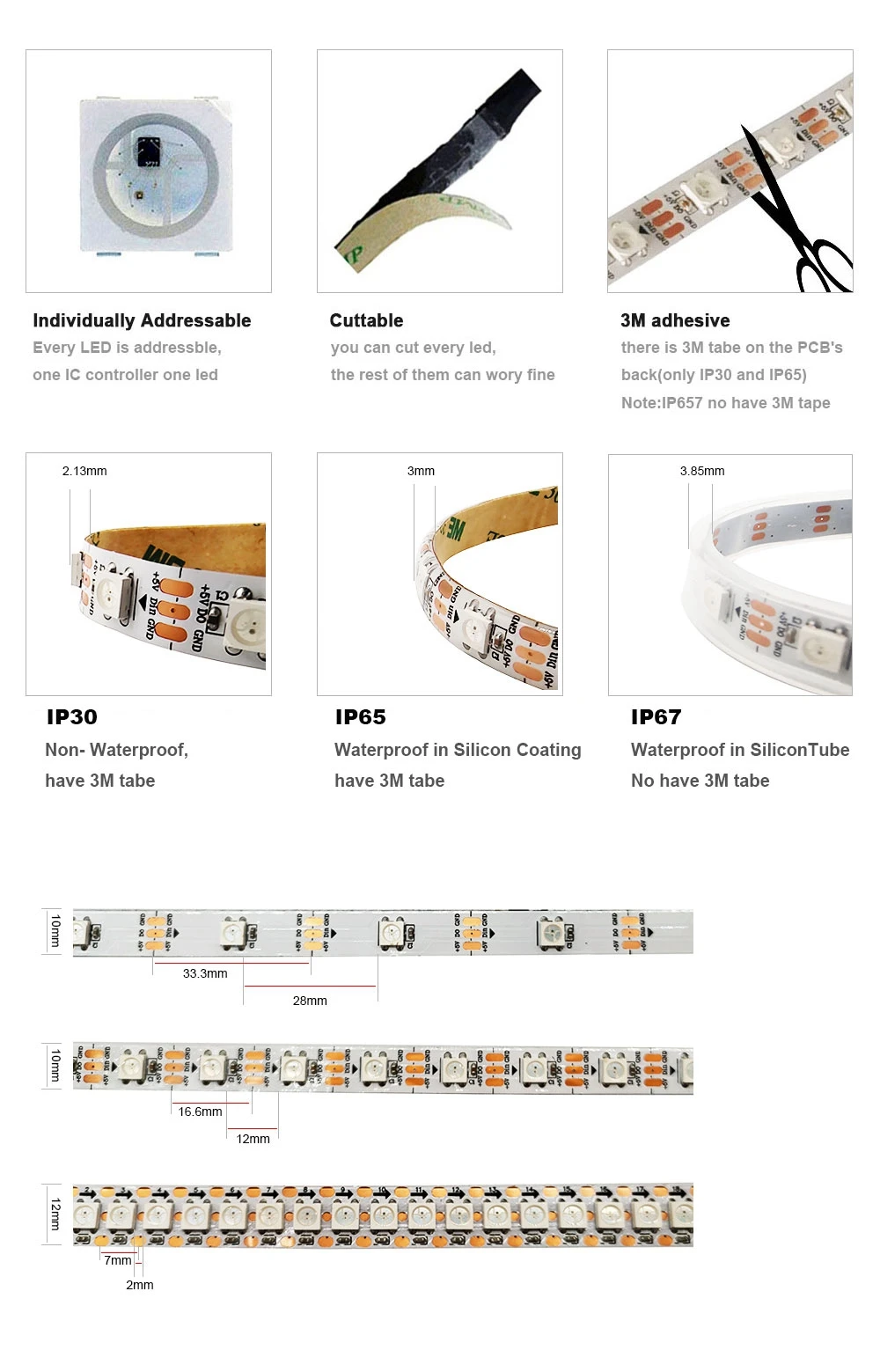 1. 3-контактный разъем JST разъем в комплекте: красный, защита от перегрузки: VCC лозы: GND, Зеленый: данные. 2. Лента имеет 3M клейкая лента на задней части (за исключением IP67). 4. Светодиодная лента может быть разделена между каждым светодиодом для создания пользовательских длин. 5. Не сгибайте полоску. 6. Более длительные пробежки должны питаться от обоих концов, чтобы уменьшить падение напряжения. 7. 3-контактный разъем JST разъем провод 20AWG.
