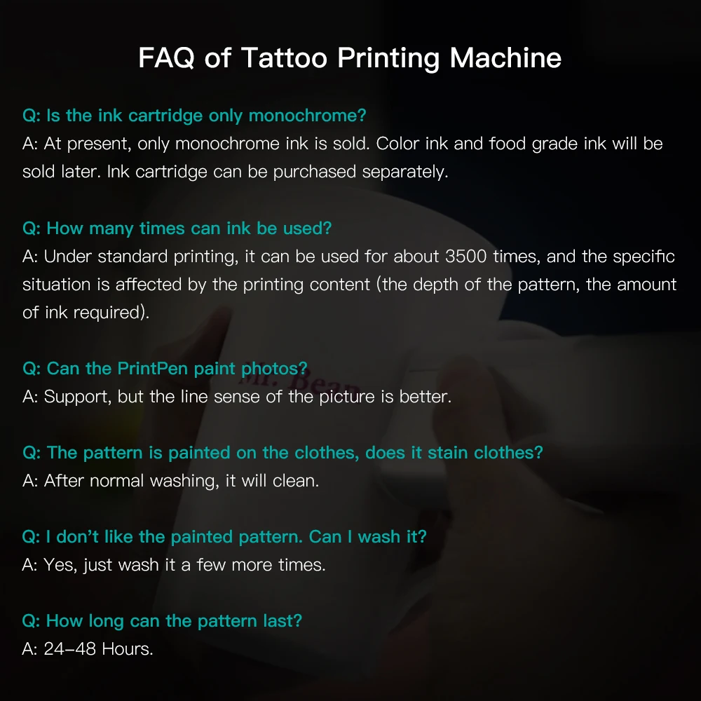 Приложение поддерживает ручной рисунок, а также может печатать слова и предложения на коже, одежде, чашках для воды, подарочной упаковке и других предметах. Яркость и контрастность рисунка/текста можно регулировать.