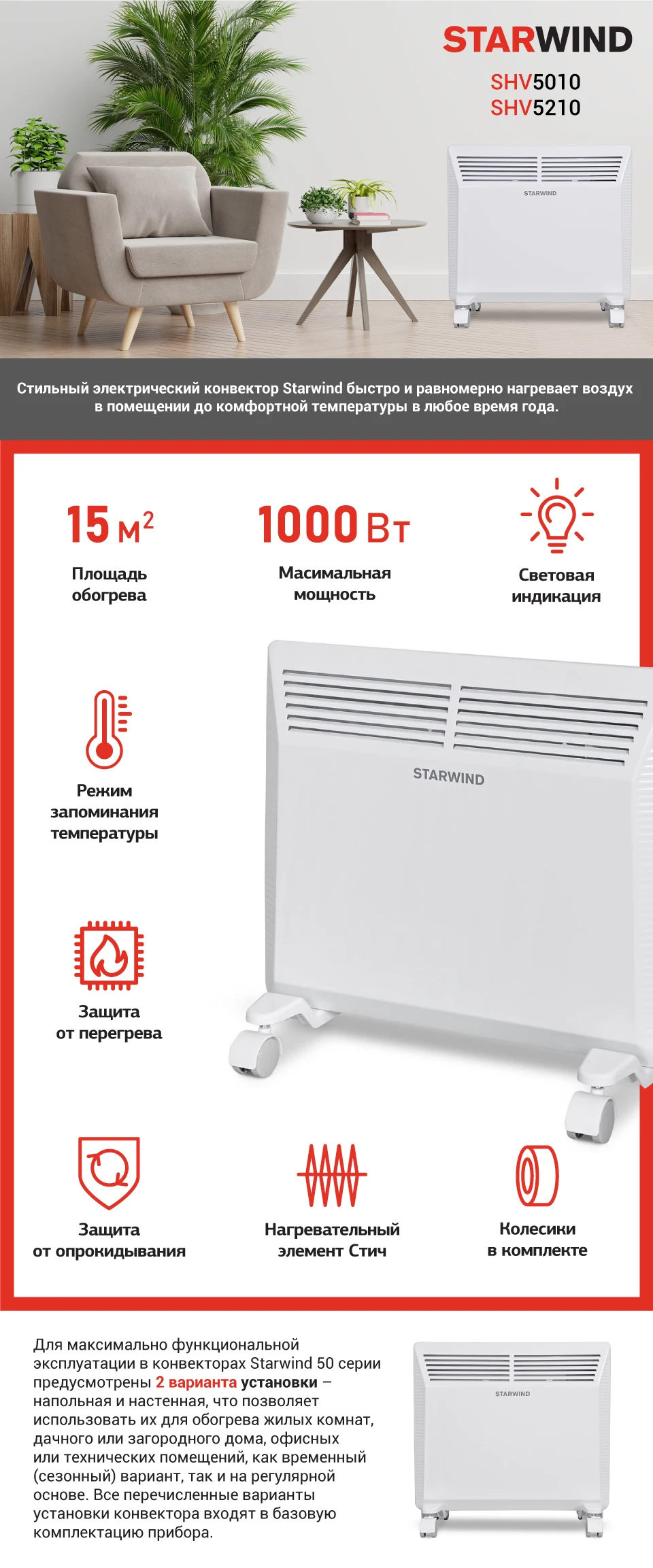 Конвектор Starwind SHV5210, 1000 Вт, белый