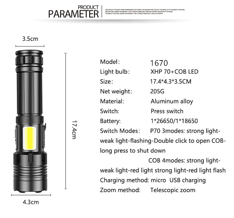 Режимы переключения: сильный светильник-средний Светильник-вспышка-COB sos