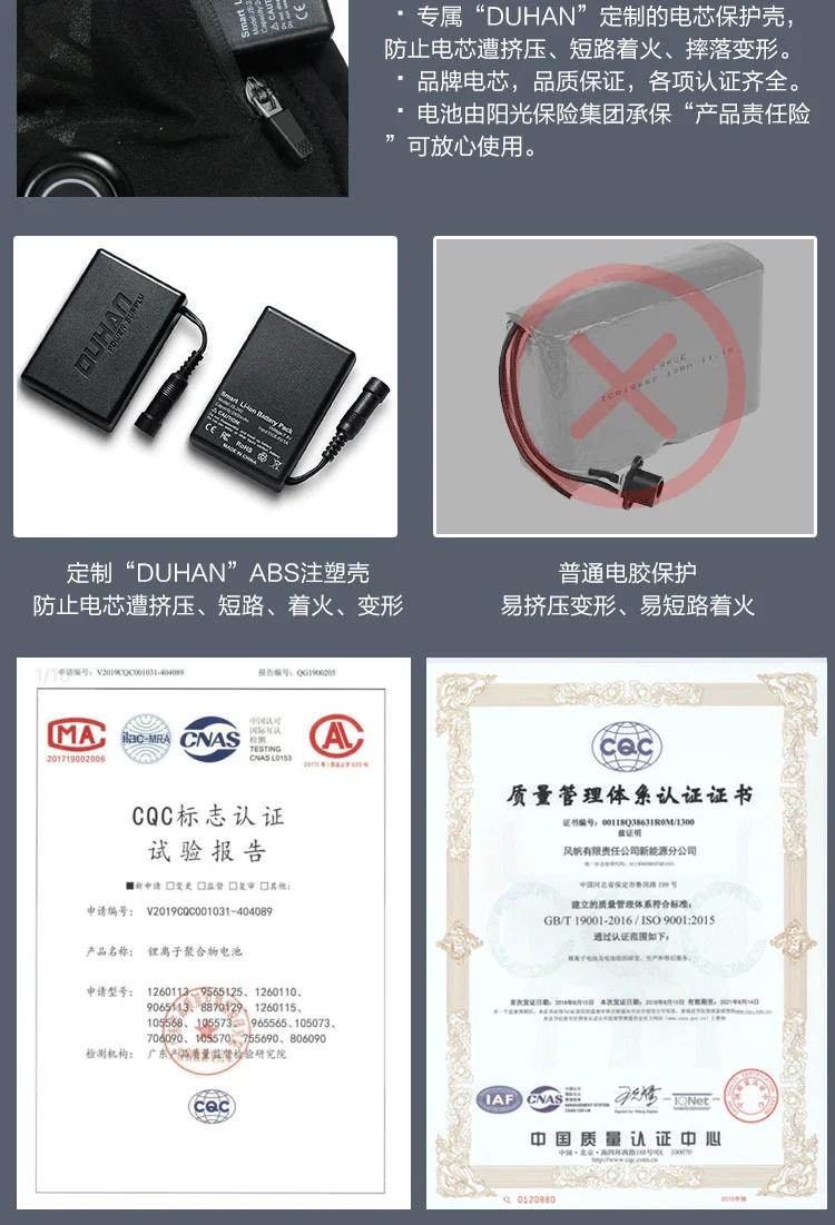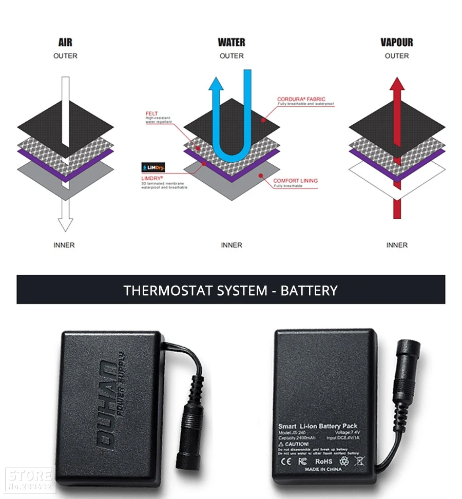 4. Характеристика: водоотталкивающая и дышащая ткань, питание от литиевой батареи, теплая и нескользящая.