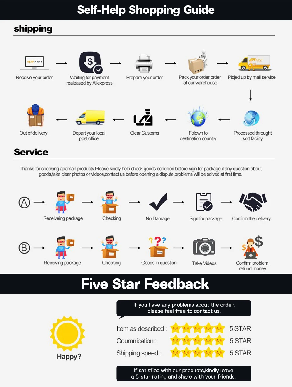1. Все товары, доставляемые из Китая, могут вызвать тарифы. Пожалуйста, хорошо узнайте о законах импорта в вашей стране. Все продукты, продающие Стандартные условия FOB, покупатели возьмут на себя ответственность за все виды налогов в своей стране. Если у вас есть особые пожелания по декларированию, пожалуйста, оставьте нам сообщение при оформлении заказа.