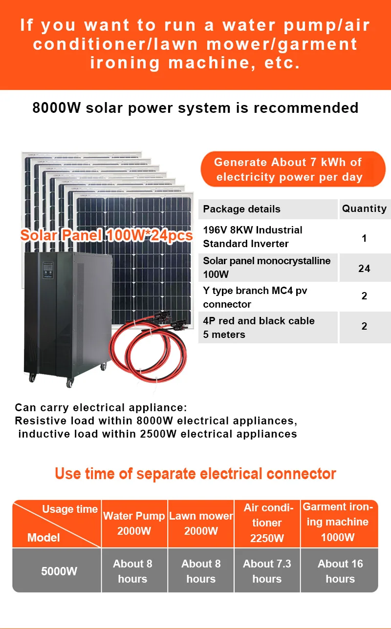 Если вы хотите запустить водяной насос/кондиционер/газонокосилку/швейную гладильную машину и т. д. рекомендуется система солнечной энергии 8000 Вт