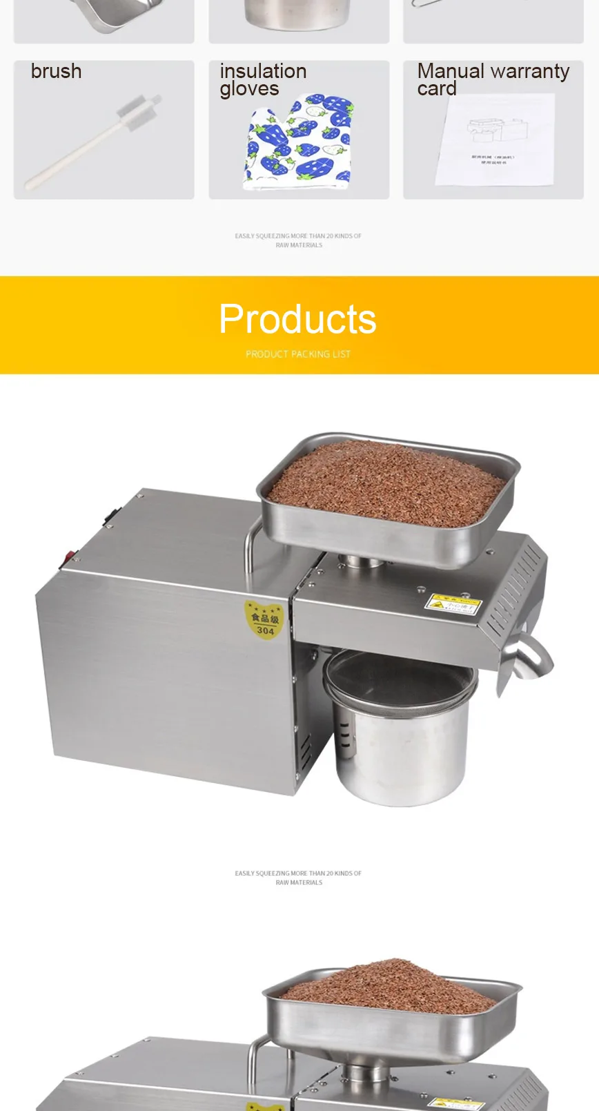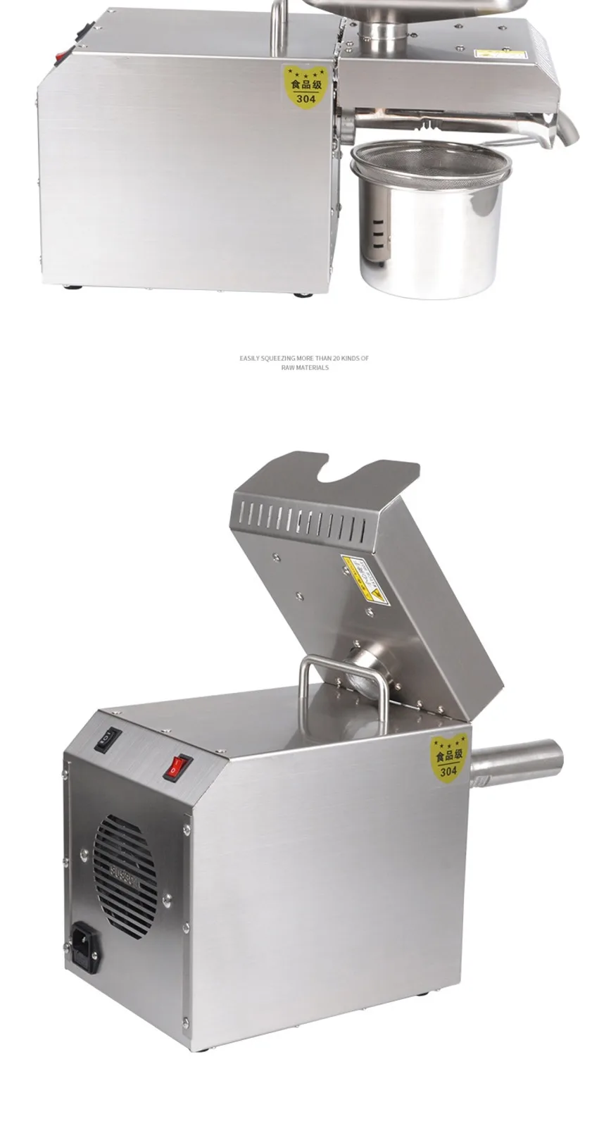 Машина для холодного прессования масла, автоматическая машина из нержавеющей стали для холодного отжима масла, экстрактор масла семян подсолнечника, масляный пресс Пожалуйста, предварительно Нагрейте машину более 20 минут, а затем сделайте масло. Особенности Это одна многофункциональная домашняя машина для прессования масла (машина для холодного пресса), вы также можете использовать ее для малого бизнеса. Вы можете использовать эту машину для прессования практически всех видов семян, таких как миндаль, аргановое зерно, черный тмин, семена камелии, семена канолы (рапса), семена Кастора, семена ЧИА, Семена хлопка, зародыши кукурузы, пищевая фиолетовая Перилла, семена льна (лен Абердин), семена травы, семена конопли, семена ятрофы, семена жожоба, семя киви, семена Моринги, семена нима, семена окры, арахис, перец (сухой), ядро кедрового ореха, семена платиклади, семена колючей золы, семена тыквы, семена шиповника, Семена сафлора, шизандра, кунжут (черный кунжут и белый кунжут), соя, семена подсолнечника, орех и орехи макадамии. Если вы хотите использовать его для других семян, пожалуйста, свяжитесь с нами. Высокая скорость извлечения масла, вы можете получить 400 г масла из арахиса 1000 г. Простота в эксплуатации (руководство на английском языке) и может быть непрерывной работой без вздутия или перегрева. Мини-пространство и низкий уровень шума. Длительный срок службы, более 10 лет для домашнего использования. AC110V/60Hz, 220V/50Hz или 220V/60Hz доступен с штепсельной вилкой Великобритании/США/Австралии/ЕС