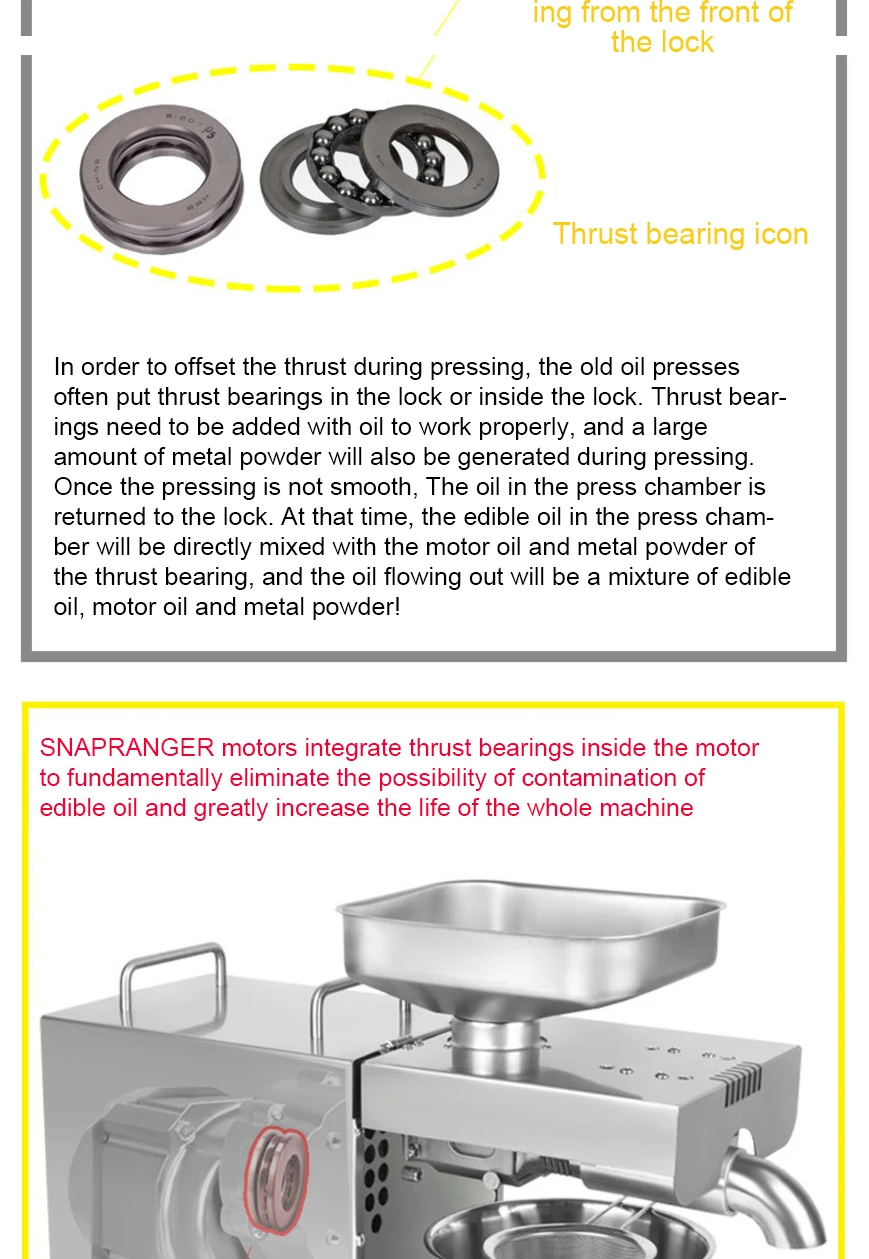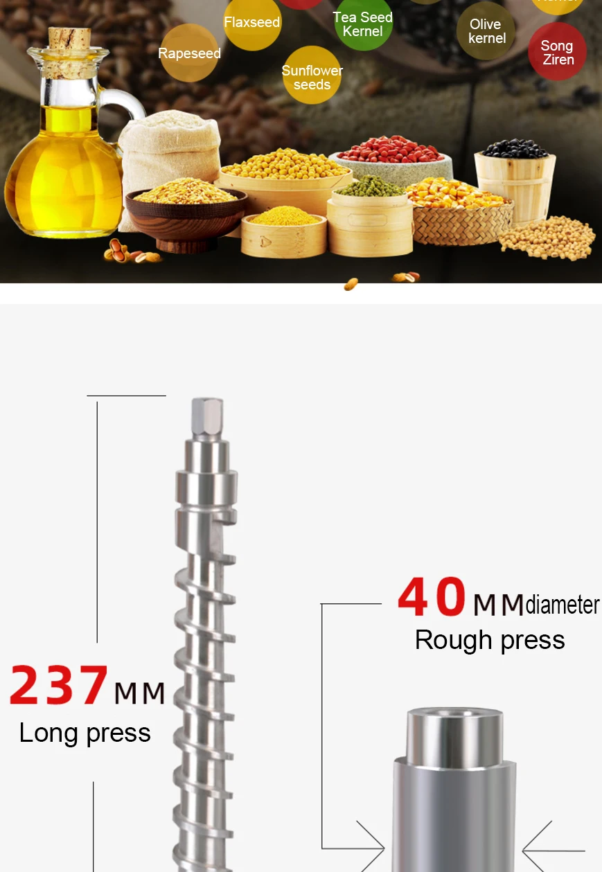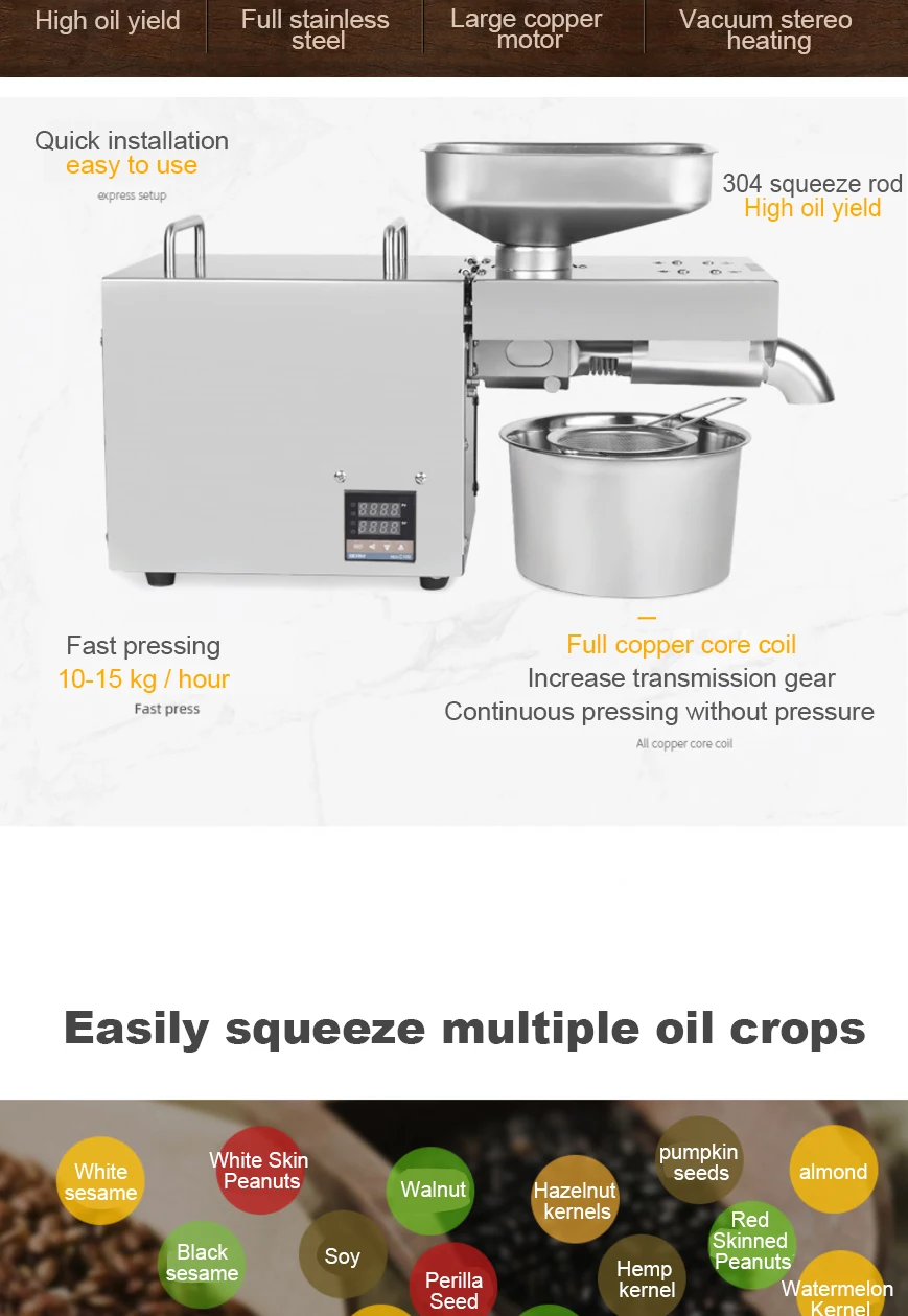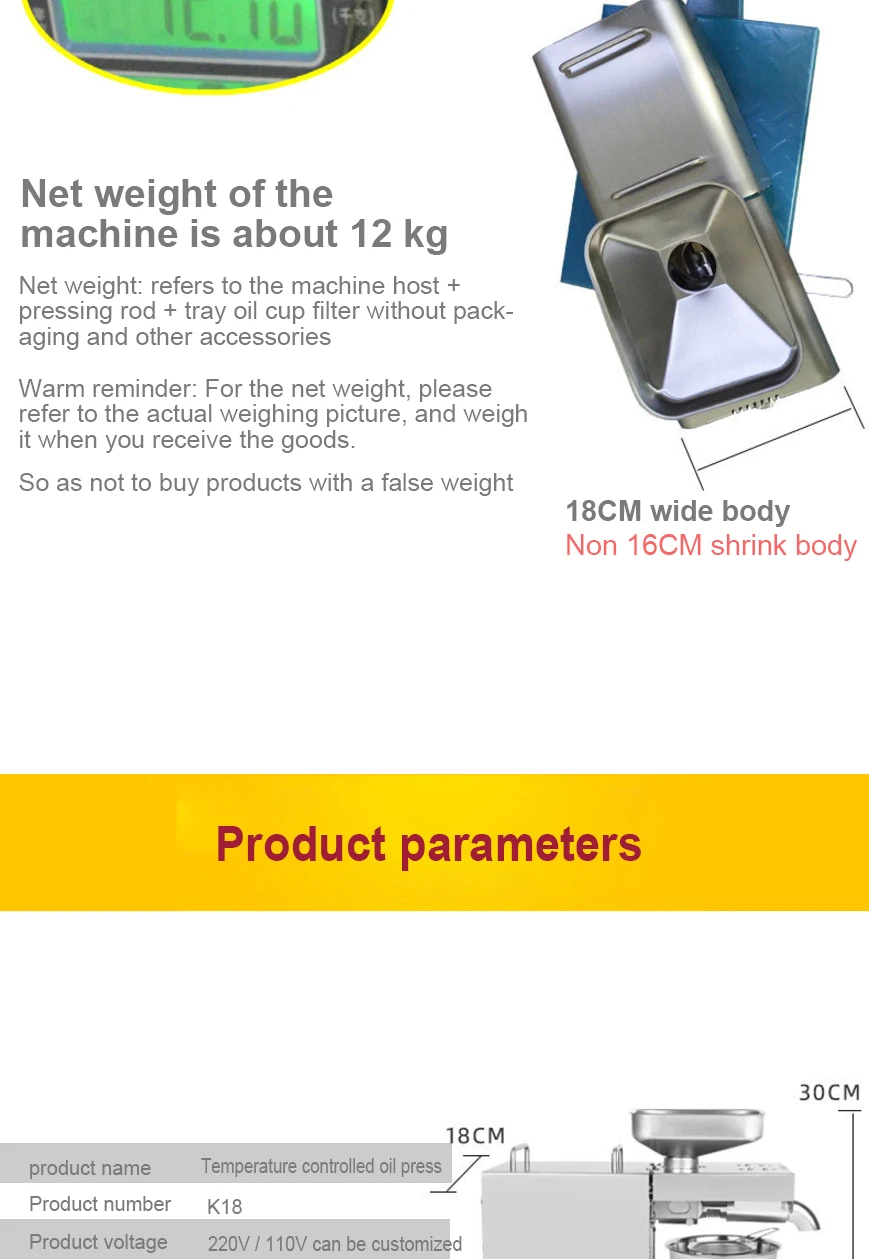 Машина для холодного прессования масла, автоматическая машина из нержавеющей стали для холодного отжима масла, экстрактор масла семян подсолнечника, масляный пресс Пожалуйста, предварительно Нагрейте машину более 20 минут, а затем сделайте масло. Особенности Это один многофункциональный домашний пресс для масла (машина для холодного пресса), вы также можете использовать его для малого бизнеса. Вы можете использовать эту машину для прессования практически всех видов семян, таких как миндаль, аргановое зерно, черный тмин, семена камелии, семена канолы (рапса), семена Кастора, семена ЧИА, Семена хлопка, зародыши кукурузы, пищевая фиолетовая Перилла, семена льна (лен Абердин), семена травы, семена конопли, семена ятрофы, семена жожоба, семя киви, семена Моринги, семена нима, семена окры, арахис, перец (сухой), ядро кедрового ореха, семена платиклади, семена колючей золы, семена тыквы, семена шиповника, Семена сафлора, шизандра, кунжут (черный кунжут и белый кунжут), соя, семена подсолнечника, орех и орехи макадамии. Если вы хотите использовать его для других семян, пожалуйста, свяжитесь с нами. Высокая скорость извлечения масла, вы можете получить 400 г масла из арахиса 1000 г. Простота в эксплуатации (руководство на английском языке) и может быть непрерывной работой без вздутия или перегрева. Мини-пространство и низкий уровень шума. Длительный срок службы, более 10 лет для домашнего использования. AC110V/60Hz, 220V/50Hz или 220V/60Hz доступен с штепсельной вилкой Великобритании/США/Австралии/ЕС
