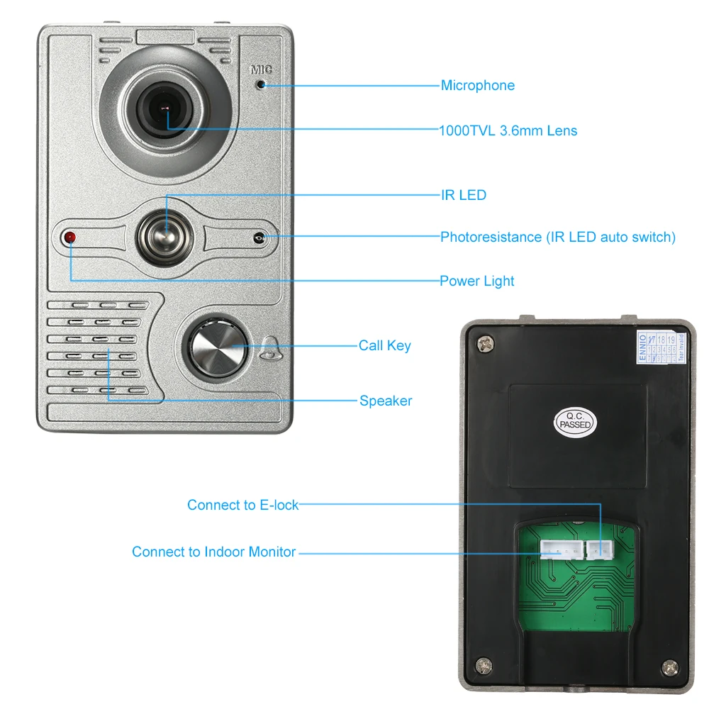Это 7 дюймов Цвет ЖК-дисплей видео-телефон двери, в который входят одна наружная камера с водонепроницаемой функцией и один внутренний монитор. Он поддерживает наблюдение в режиме реального времени, визуальный домофон, удаленную разблокировку, инфракрасное ночное видение и непромокаемую функцию. Вы можете следить за тем, что произошло перед вашей дверью с помощью внутреннего монитора. Он предоставляет вам четкие изображения для мониторинга как днем, так и ночью из-за ИК-светодиодов. Он широко используется в квартирах, домах, гостиницах, офисах, общественных зданиях, виллах, фабриках и т. д.