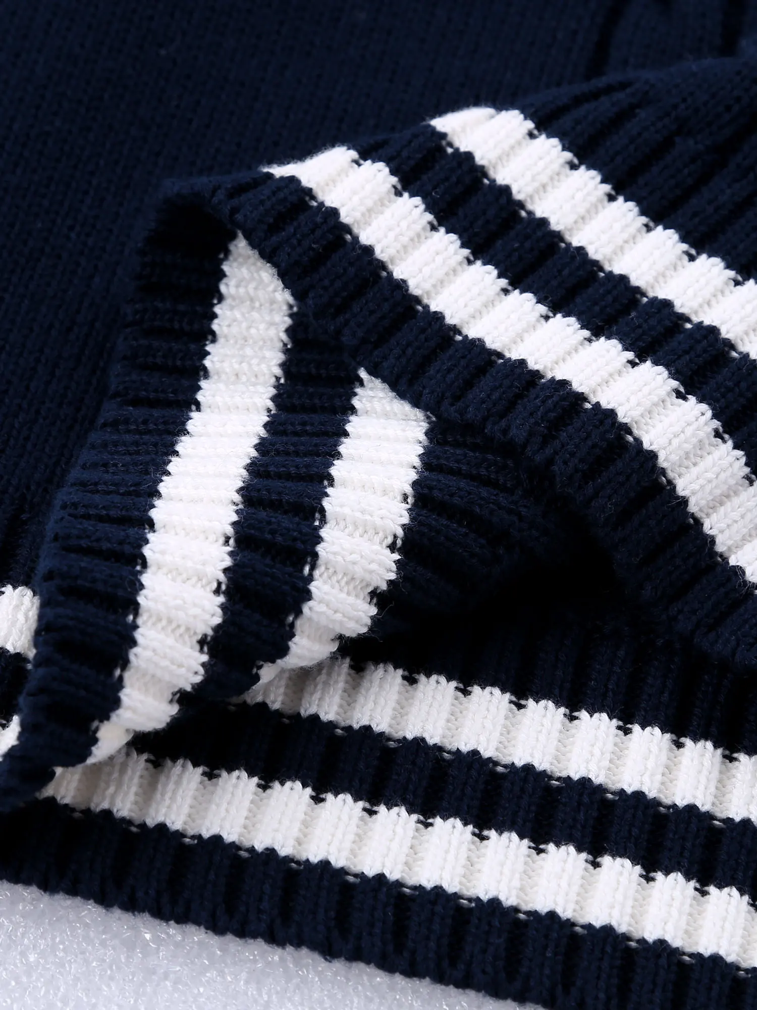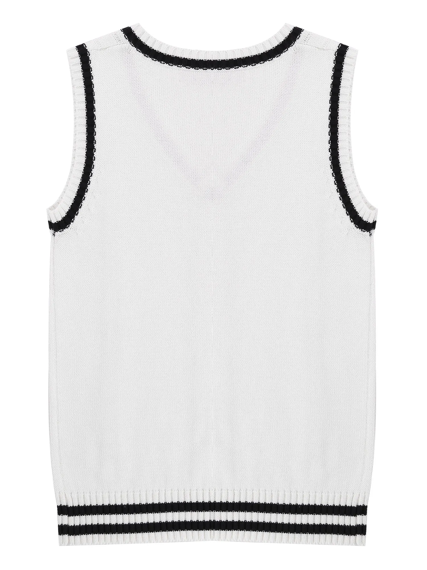V-образная горловина, без рукавов, трикотажная вязка в полоску на подоле свитера.