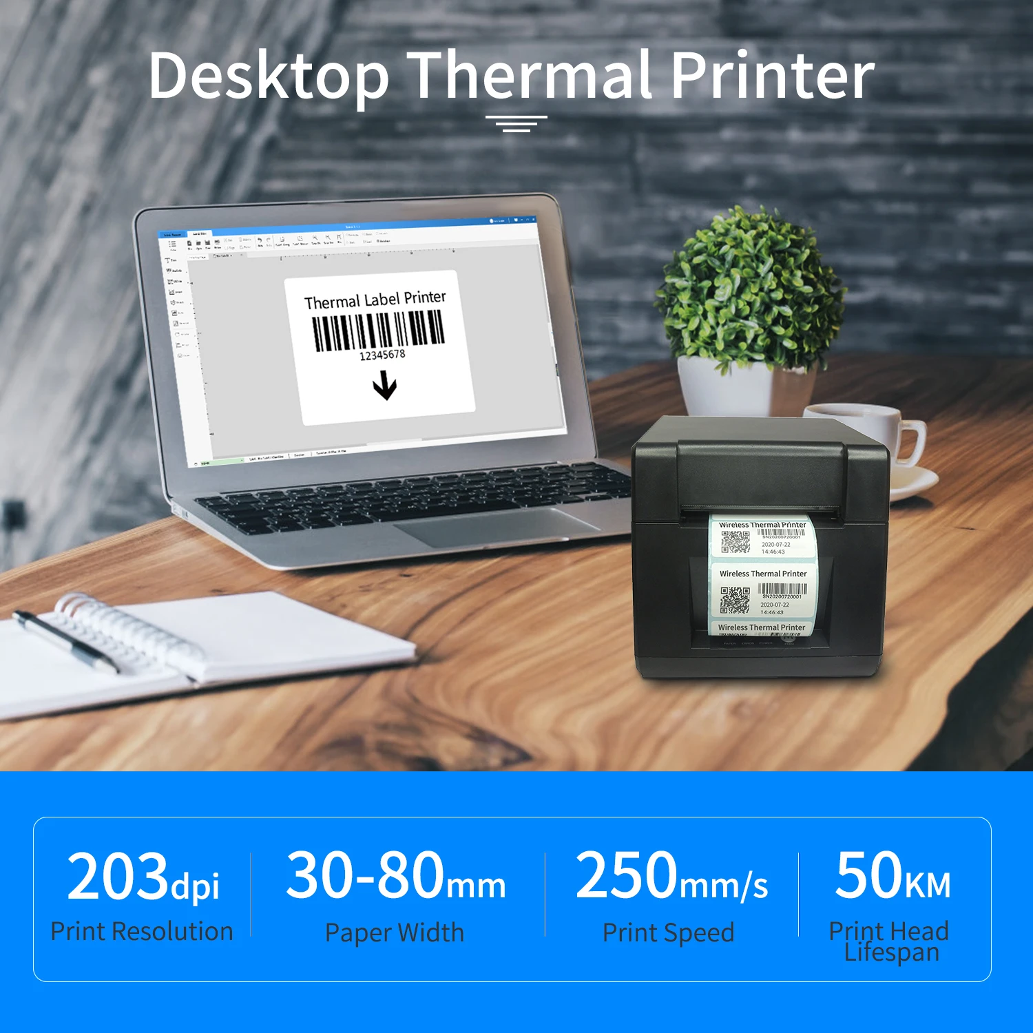 Портативный принтер для этикеток, разрешение 203 точек/дюйм, поддержка размера бумаги 30-80 мм, скорость печати до 250 мм/сек., высокая эффективность и четкая печать.