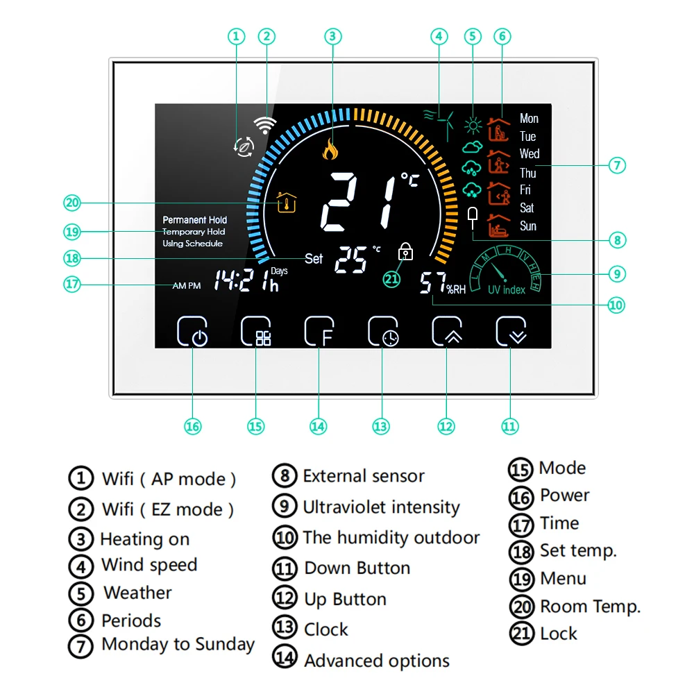 Нажмите и удерживайте кнопки для 5s, чтобы заблокировать/разблокировать термостат, вы можете выбрать полный замок или полузамок.