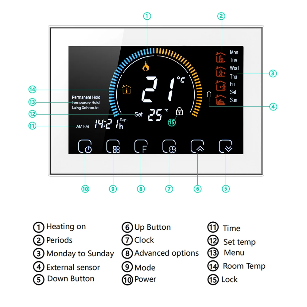 Программируемый режим 5 + 1 + 1 шесть периодов обеспечивает максимальный комфорт и экономичность, переключение ручного или программируемого режима.