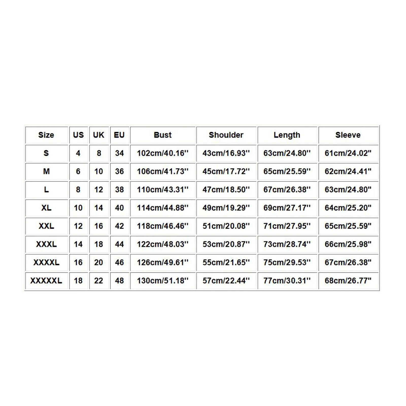 Размер США Великобритания ЕС Бюст Плечо Длина Рукав S 4 8 34 102 см/40,16'' 43 см/16,93'' 63 см/24,80'' 61 см/24,02'' М 6 10 36 106 см/41,73'' 45 см/17,72'' 65 см/25,59'' 62 см/24,41'' L 8 12 38 110 см/43,31'' 47 см/18,50'' 67 см/26,38'' 63 см/24,80'' XL 10 14 40 114 см/44,88'' 49 см/19,29'' 69 см/27,17'' 64 см/25,20'' XXL 12 16 42 118 см/46,46'' 51 см/20,08'' 71 см/27,95'' 65 см/25,59'' XХХL 14 18 44 122 см/48,03'' 53 см/20,87'' 73 см/28,74'' 66 см/25,98'' XXXXL 16 20 46 126 см/49,61'' 55 см/21,65'' 75 см/29,53'' 67 см/26,38'' XXXXXL 18 22 48 130 см/51,18'' 57 см/22,44'' 77 см/30,31'' 68 см/26,77''
