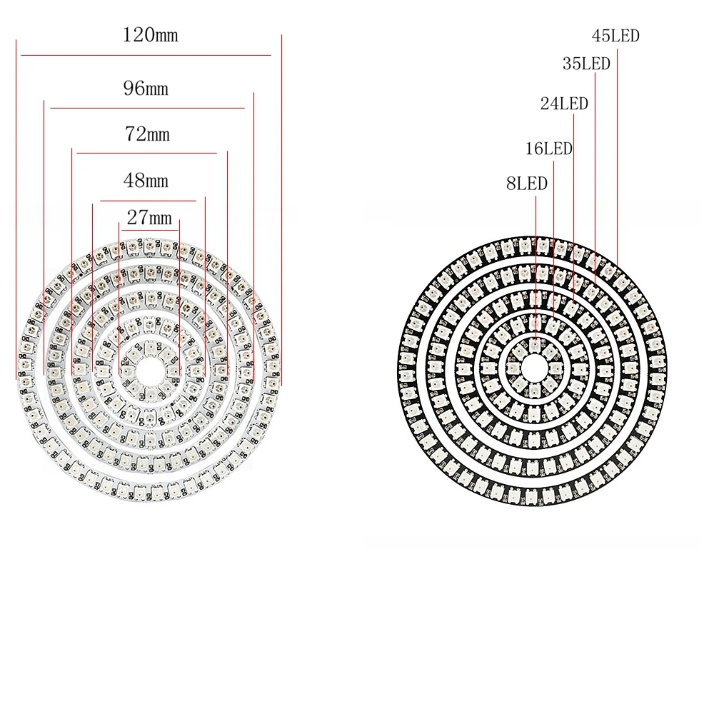 Существует одна линия данных с очень специфичным Протоколом по времени. Поскольку Протокол очень чувствителен к синхронизации, он требует использования микроконроллера в реальном времени, такого как AVR, rduino, PIC, mbed и т. д. Его нельзя использовать с микрокомпьютером на базе Linux или интерпретируемым микроконтроллером, таким как netduino или Basic Stamp. Чип: WS2812 (встросветодиодный ОД) светодиод: 8/16/24/35/45/128 шт. 5050 RGB полноцветное подсветка напряжение: 5 В