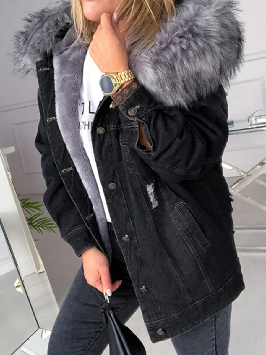 Женское теплое мягкое меховое пальто, джинсовая куртка, зимнее плюшевое пальто, элегантное большое меховое пальто с капюшоном, верхняя одежда, осенние женские длинные куртки
