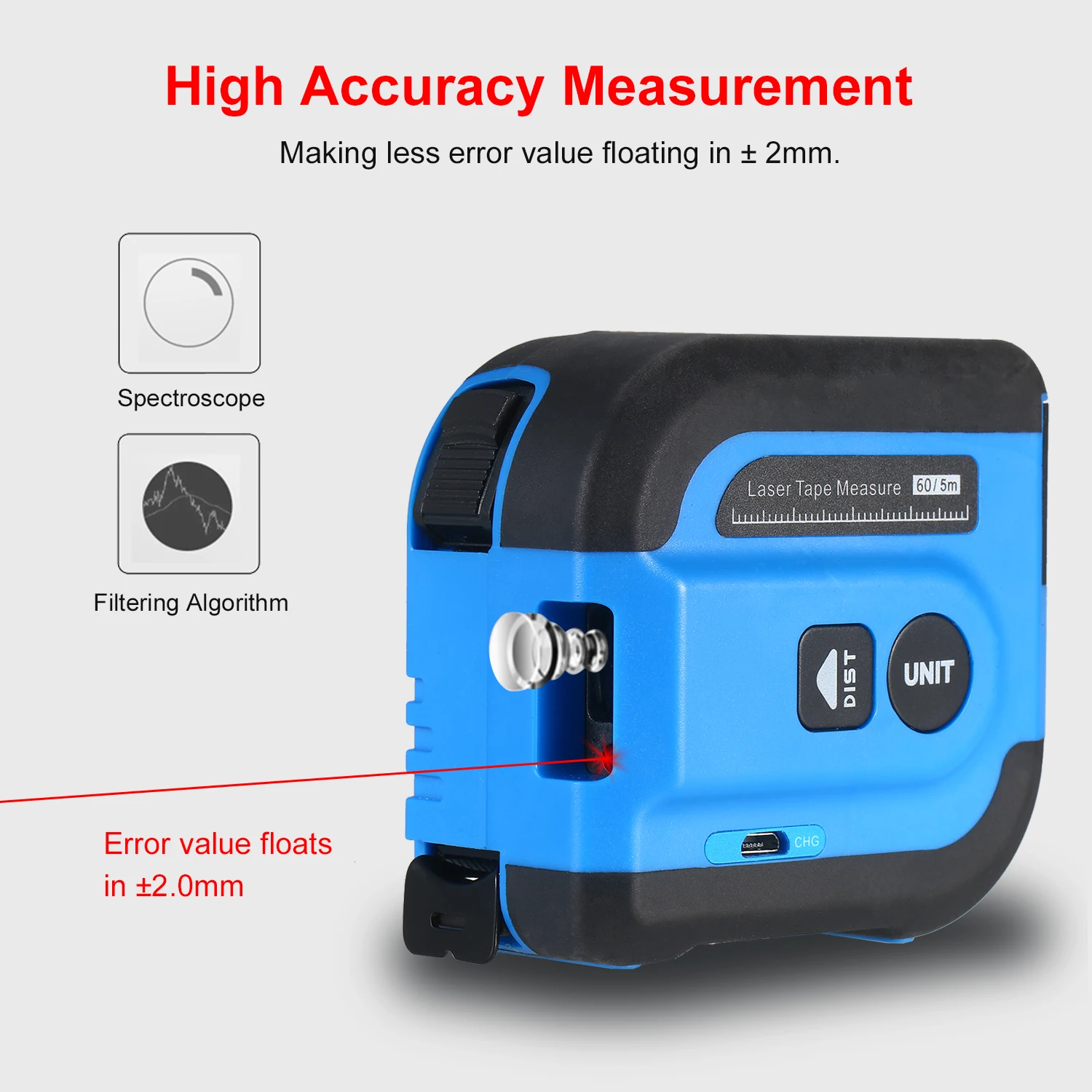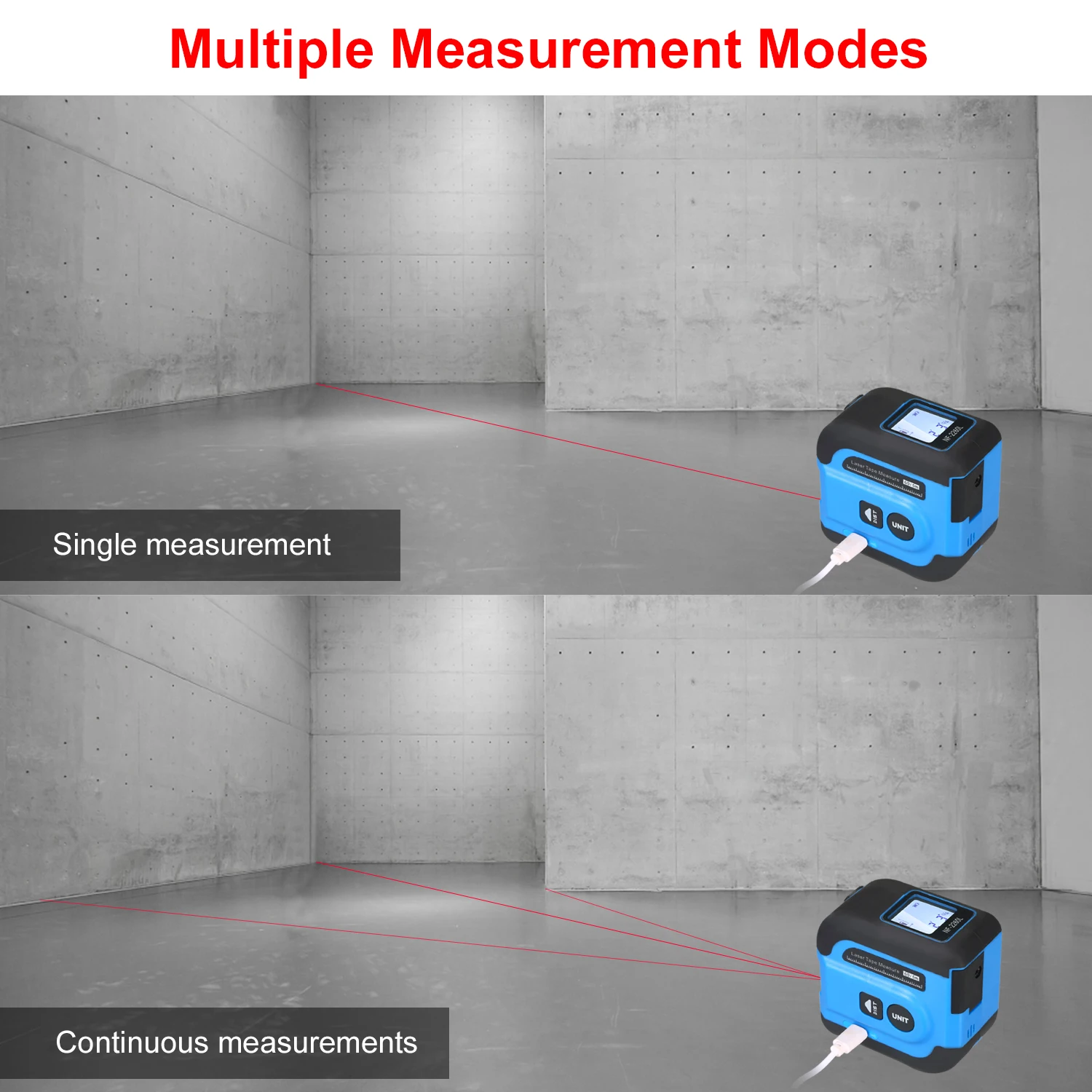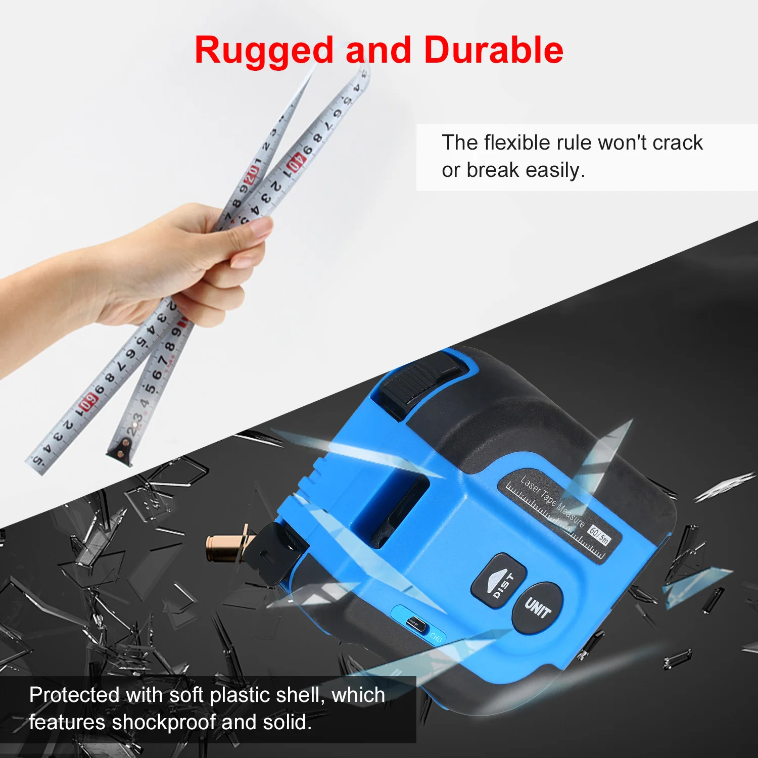 Измерение лазерной ленты может измерять расстояния до 196/131 футов; В то время как физическая измерительная лента достигает до 16,4 футов.