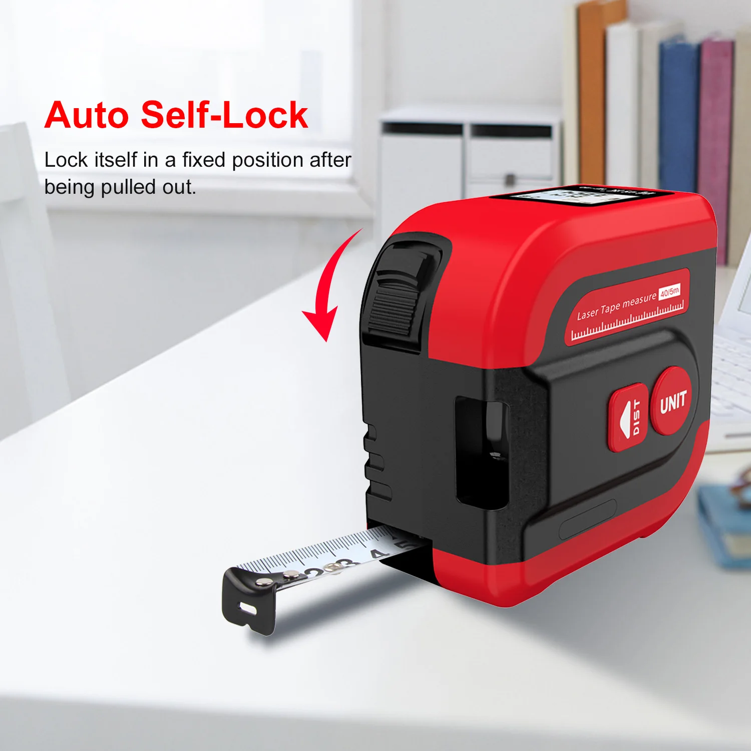 Tapeline зафиксирует себя в фиксированном положении после вытягивания и автоматически отключается при нажатии кнопки самофиксации.