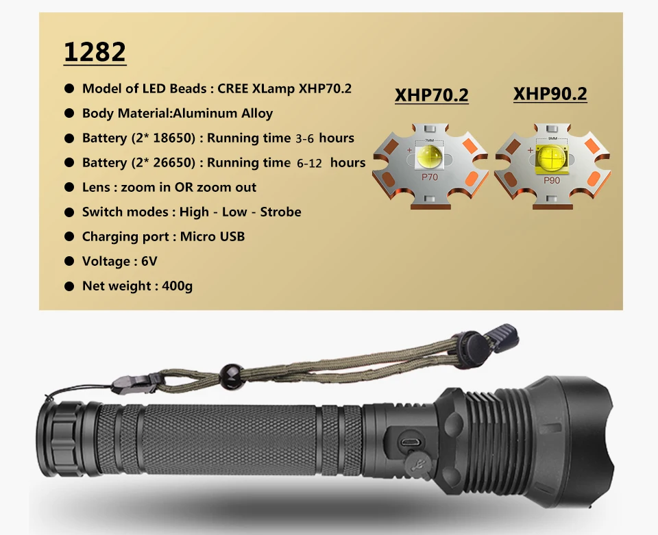 Модель1287-P51282-P71282-P9Модель светодиодный бусины:XHP50.2XHP70.2XHP90.2Люмен2000 лм4000 лм8000 лмАккумулятор1*18650 или 1*26650 аккумуляторАккумулятор 2*18650 или 2*26650Аккумулятор 2*18650 или 2*26650Режим переключения5 режимов3 режима3 режимаРазмер16,6*4*3,3 см24,3*6*3,3 см24,3*6*3,3 смВес200 г400 г400 г
