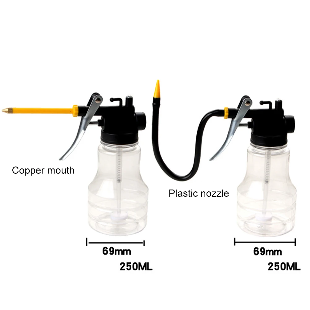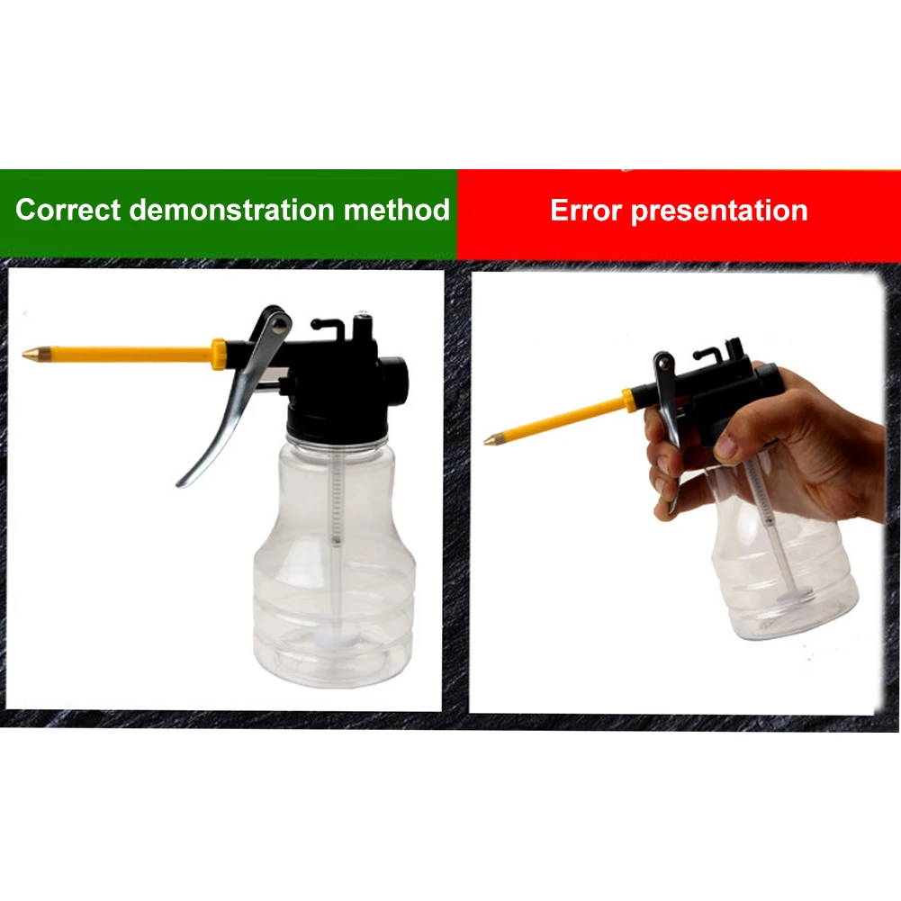 1. Масляный пистолет высокого давления, оснащенный гибким прецизионным латунным соплом, быстрым смазыванием, ВПРЫСКОМ на большие расстояния до 5 метров или более. 2. Два типа сопла, твердый и мягкий, мягкое сопло более гибкое при использовании. 3. Высококачественная масленка изготовлена из прочного пластика, износостойкого и ударопрочного. 4. Этот смазочный масленка может быть заполнен всеми видами тонкой смазочной жидкости и различными типами химических реагентов. 5. Портативное смазочное масло может иметь компактный размер и легкий вес, удобно использовать