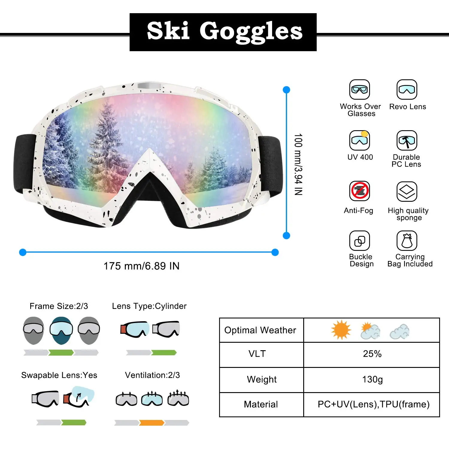 Четкое видение днем и ночью в любых погодных условиях: различные Объективы VLTs обеспечивают отличное Панорамное видение и чистый обзор на всем пути на склоне. Подходит для ваших собственных спортивных принадлежностей: снежные очки поставляются с регулируемым сверхдлинным ремешком для головы, который совместим с шлемом и различными размерами головы от подростков до взрослых. Лыжные очки для мужчин и женщин Зимние очки унисекс для мужчин, женщин, мужчин и молодежи. Разработан с учетом производительности и универсальности. Регулируемый ремешок для шлема Сверхдлинный эластичный ремешок подходит для любого шлема. Он делает эти идеальные очки подходящими как для мужчин, так и для молодежи. Технология вентиляции потока Эти вентиляционные отверстия предназначены для уменьшения запотевания и оптимизации воздушного потока внутри линзы, Они предотвращают засорение снега и льда и обеспечивают максимальную защиту от ледяных ветров Прочный и удобный Гибкие Объективы из поликарбоната с мягкой оправой из ТПУ, хорошая воздухопроницаемая пена плотно прилегает к лицу и мягко держится на поверхности. Технические характеристики Размер линзы: 6,6 дюйма (Ш) x 3,1 дюйма (В) Материал линз: поликарбонат + АБС-пластик Материал оправы: ТПУ Комплекпосылка ция: 1X лыжные очки