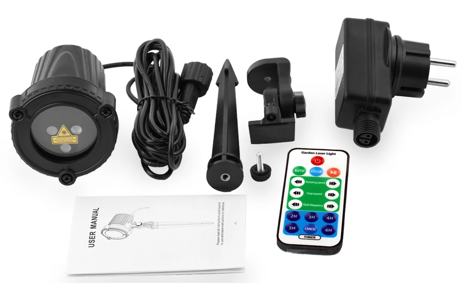 IP65 Водонепроницаемый лазерный проектор с 3 метра (9.84ft )M кабель X 1, Мощность адаптер X 1, винтов X 1 , Stand× 1, радиочастотный пульт дистанционного управления X 1 (без батареи CR2025 3V) , руководство пользователя (на английском языке) X1.