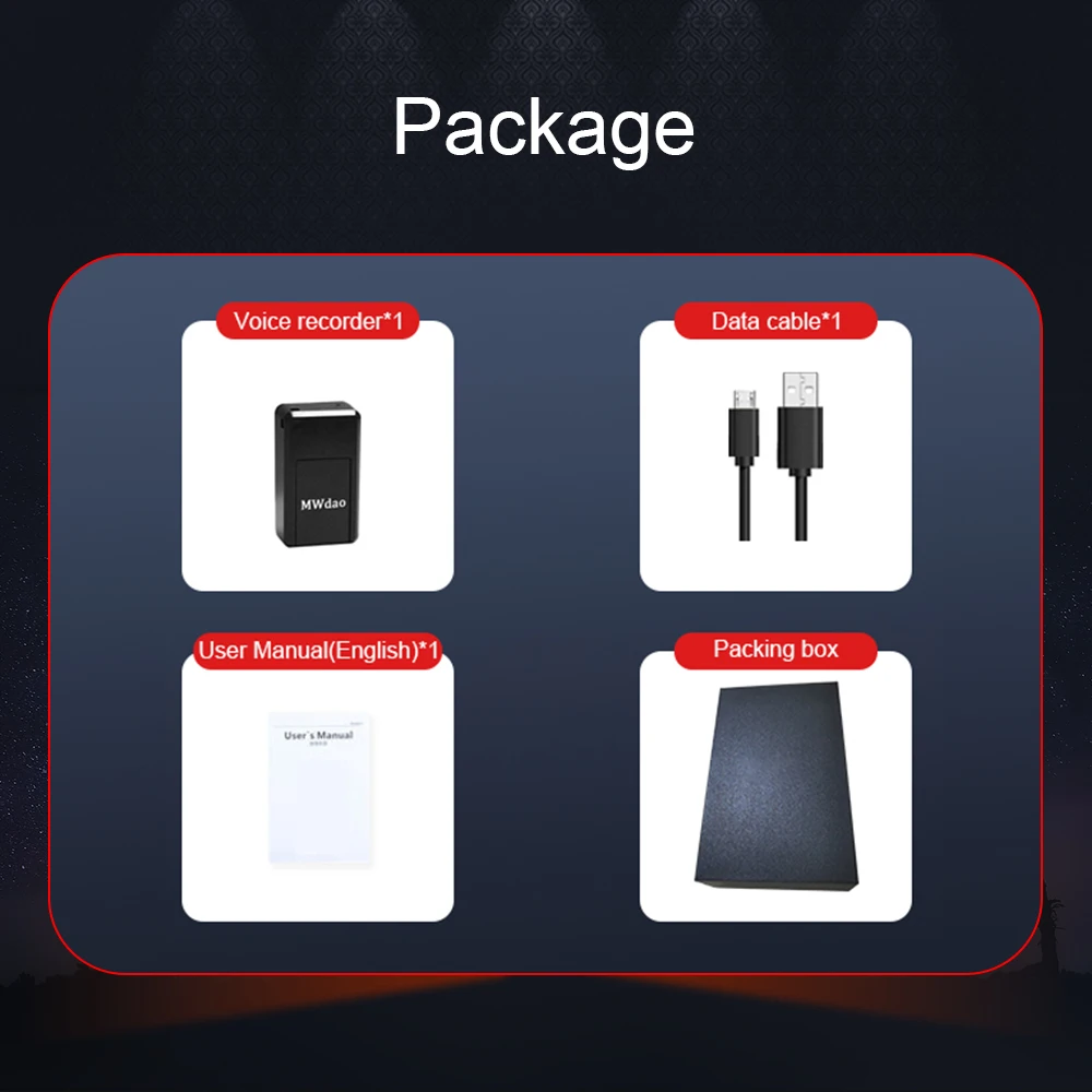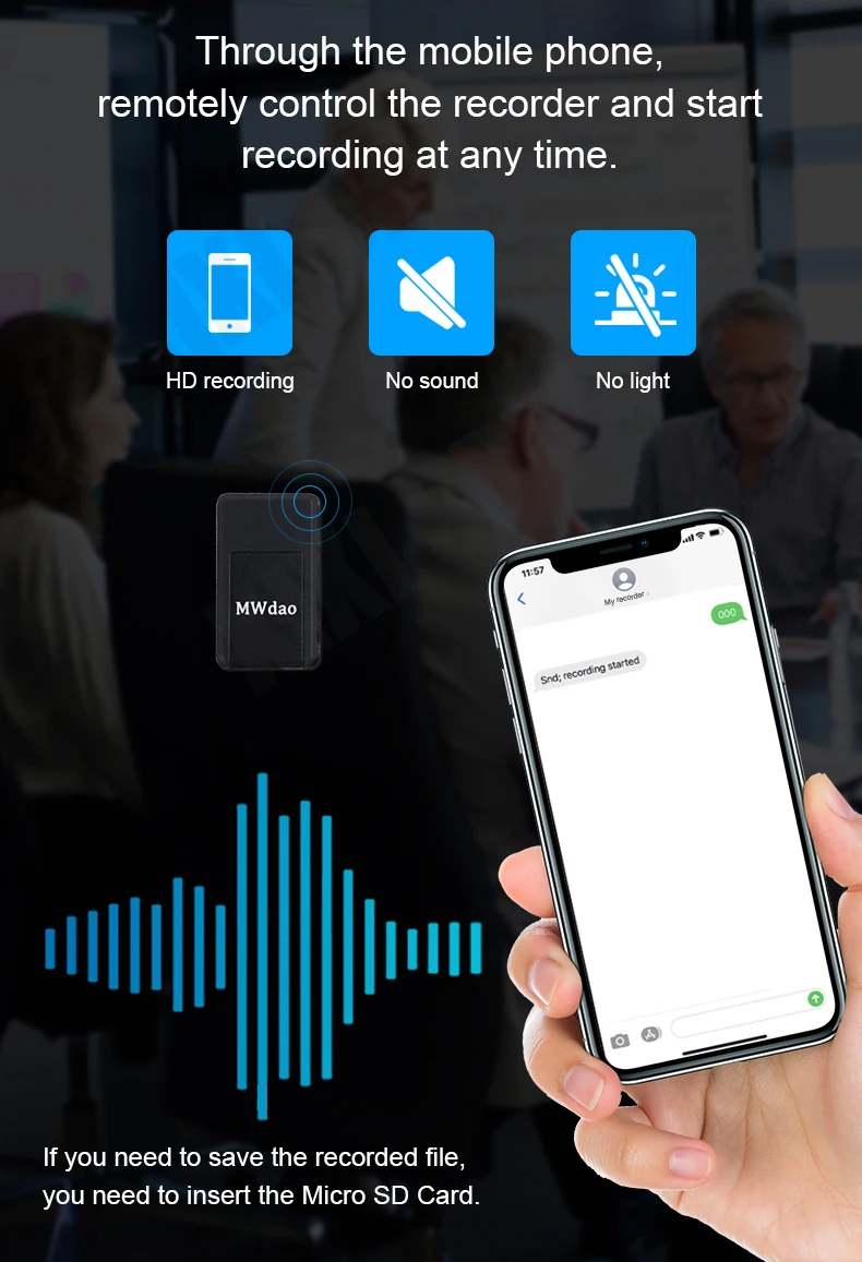 MWdao новейший рекордер Пользователи могут слышать звук сцены в реальном времени. Пользователи могут дистанционно управлять регистратором с помощью своих мобильных телефонов. Другие обычные регистраторы Пользователь не может слышать звук в реальном времени. Пользователь не может дистанционно управлять рекордер через мобильный телефон. Пользователь не может получить географическое расположение и дорожку записи. Нет функции удаленной сигнализации.