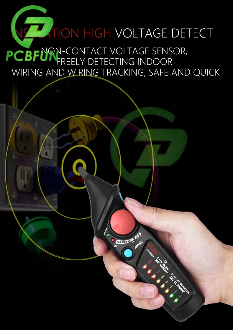 Вставьте головку датчика тестера в гнездо питания или близко к живому проводу. Когда тестер обнаруживает сигнал напряжения переменного тока, индикатор индуцированного напряжения мигает, и тестер загорается соответствующим индикатором силы сигнала (высокий, средний и низкий), И звуковой сигнал будет звучать на разных частотах одновременно. При обнаружении сигнала переменного напряжения зеленый индикатор силы сигнала (низкий) горит; При обнаружении более высокого напряжения переменного тока горит желтый индикатор силы сигнала (средний); при обнаружении наивысшего напряжения переменного тока индикатор силы красного сигнала (high) горит.