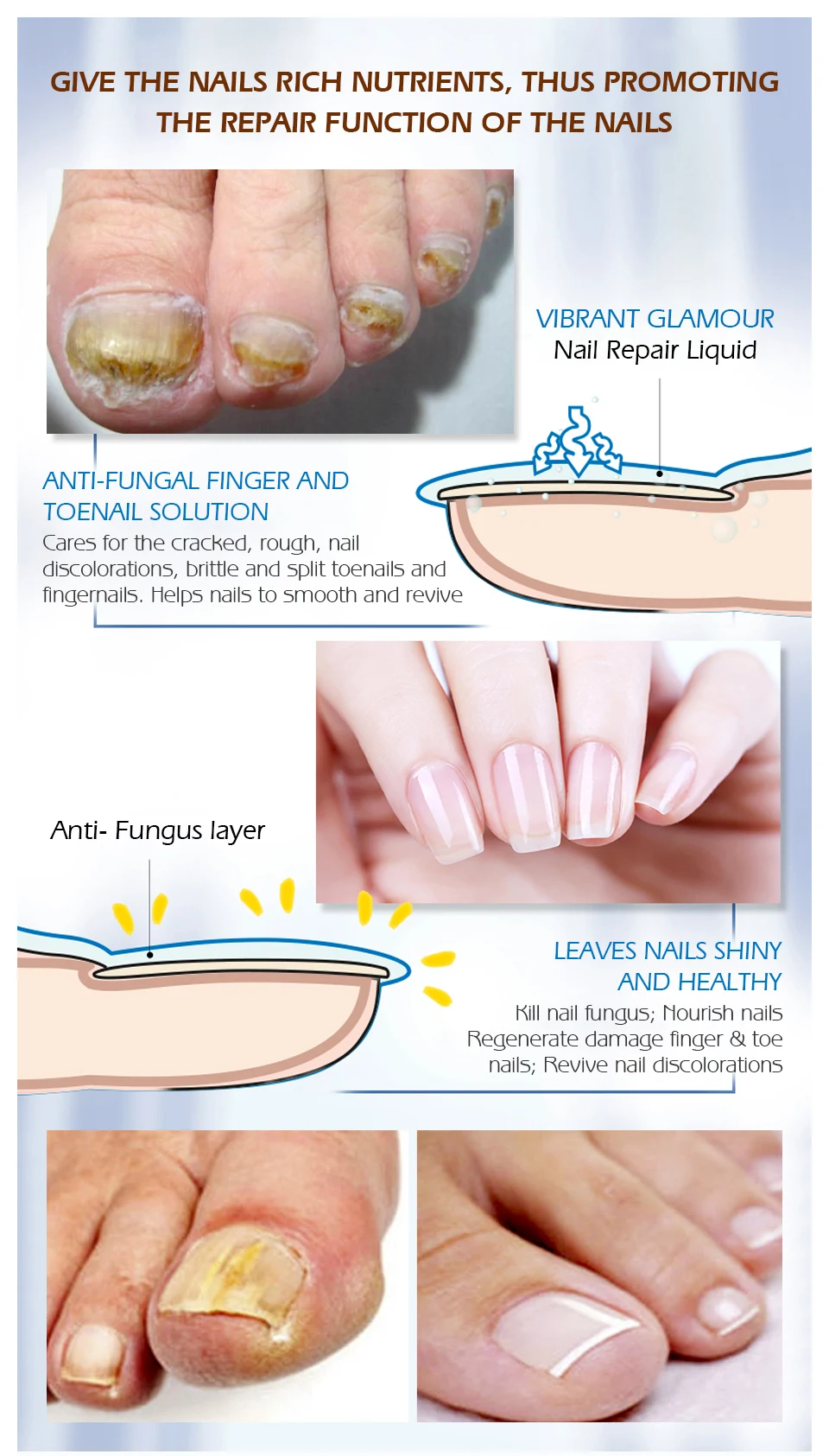 Убивает грибок ногтей; Питает ногти; Восстанавливает повреждения пальцев и пальцев ног; Оживляет обесцвечивание ногтей