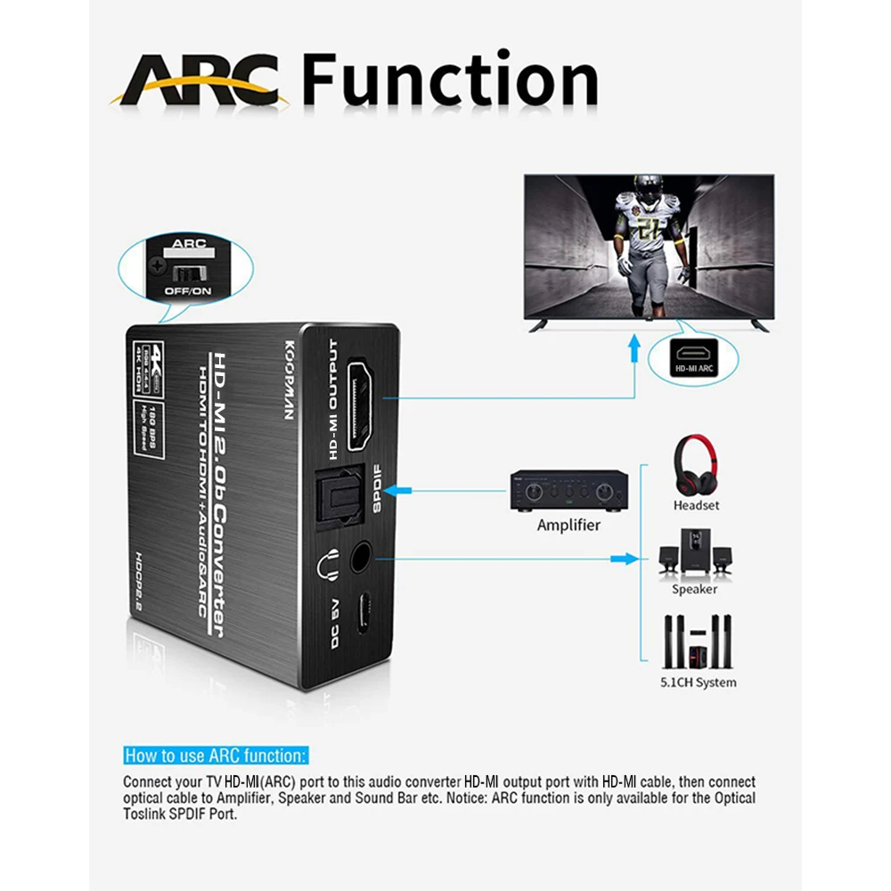 ▲При использовании функции ARC убедитесь, что светильник spdif имеет красный цвет, это означает, что преобразователь получает сигнал. И телевизору нужна поддержка ARC. ▲Когда вы открываете дугу, то пульт ДУ телевизора не может контролировать громкость, вы можете регулировать громкость только на вашем динамике/эхолоте/домашнем кинотеатре. ▲Пожалуйста, не подключайте HD TV к HD-MI входу конвертера, иначе вы не сможете получить какой-либо сигнал.