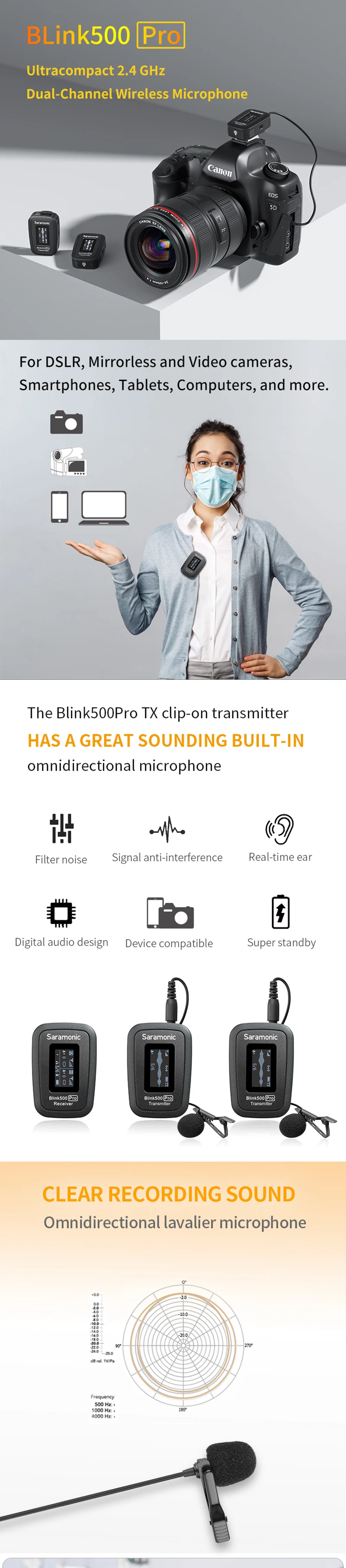 Система Saramonic Blink500 Pro Невероятно легкая, ultracompact и простая в использовании Беспроводная микрофонная система для 2 человек. Микрофон обеспечивает исключительное качество передачи звука для DSLR, беззеркальных и видеокамер, смартфонов, планшетов, компьютеров и многого другого.