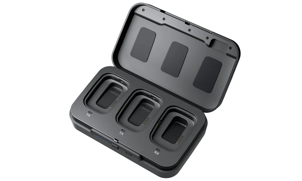 Передатчики и приемник обеспечивают замечательное время работы 8 часов на одной зарядке и обеспечивают быструю зарядку. Поставляемый зарядный чехол позволяет заряжать передатчики и приемники в любом месте и может быть перезаряжен или приведен в действие через порт USB-C 5 в постоянного тока с помощью USB-A зарядных устройств и аккумуляторов.
